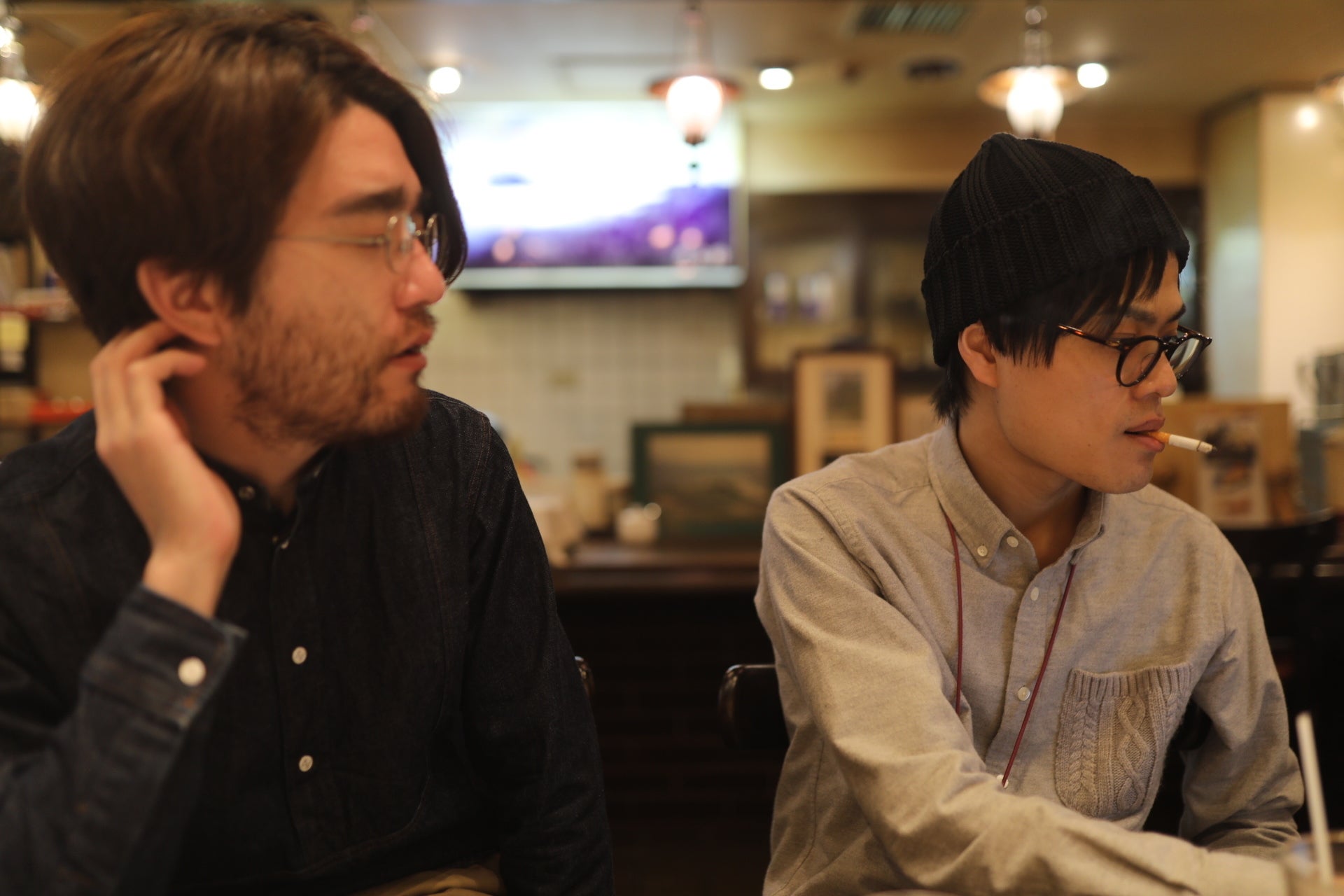 写真右側、くわえ煙草のクールエディターが天野くんです。