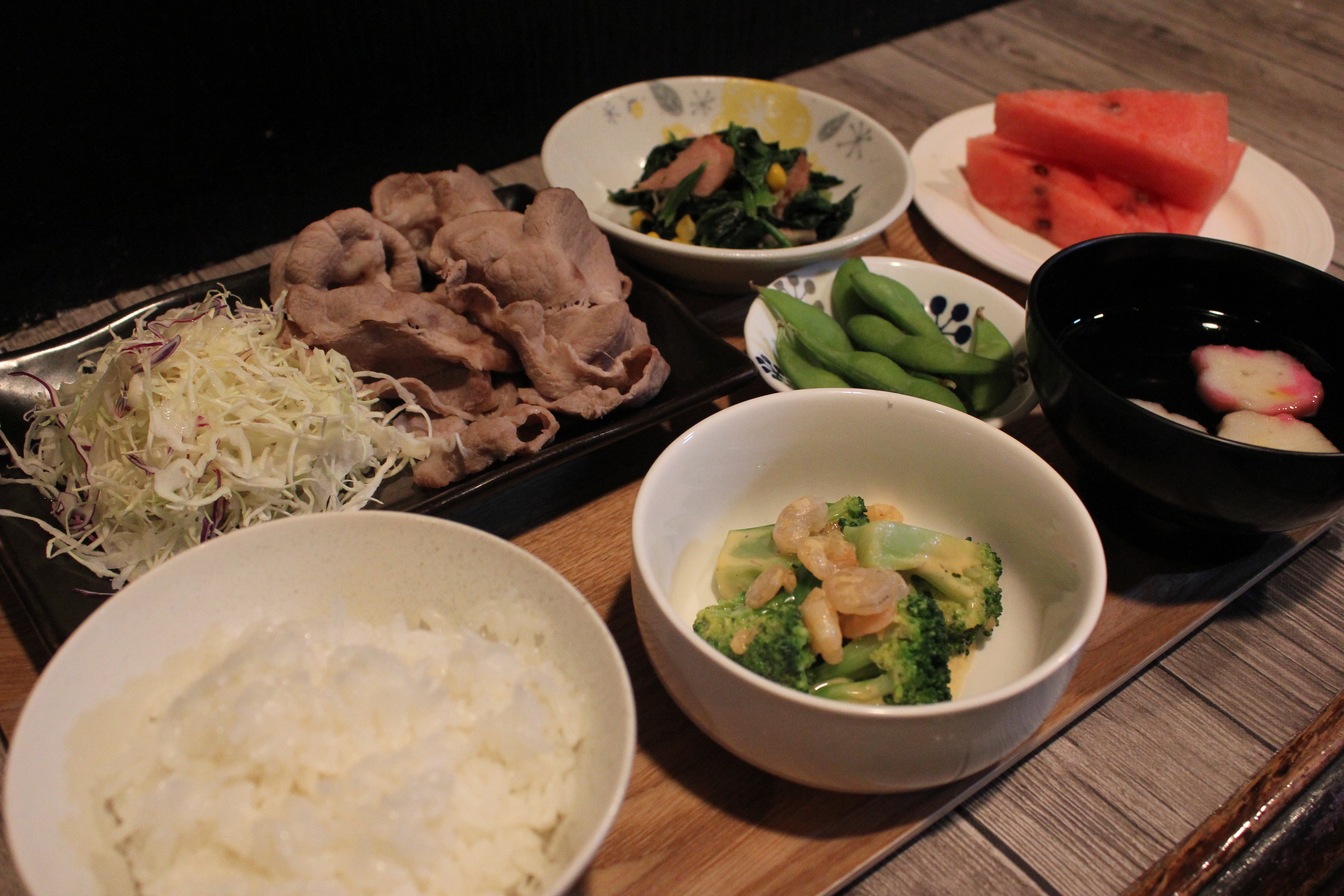 冷しゃぶ定食(仮)スイカ・バナナ・ブロッコリー・ほうれん草はカリウムが多く塩分排出に極めて有効です。