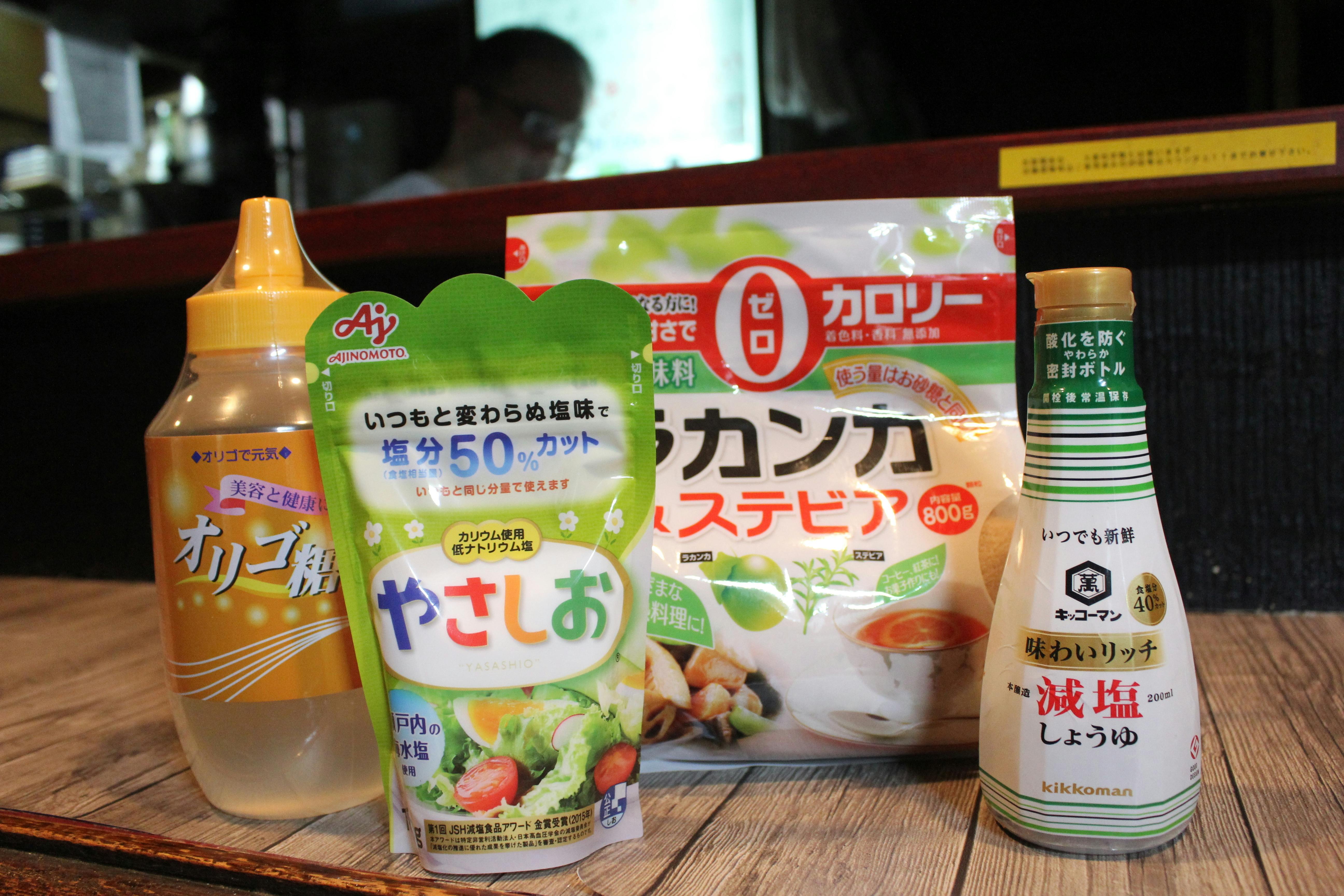 7。甘味成分は砂糖不使用でラカンカ・ラカンカ/ステビア・オリゴ糖を100%使用。塩は「やさしお(塩分50%カット塩)」を使用します。店内の醤油は減塩生醤油使用。