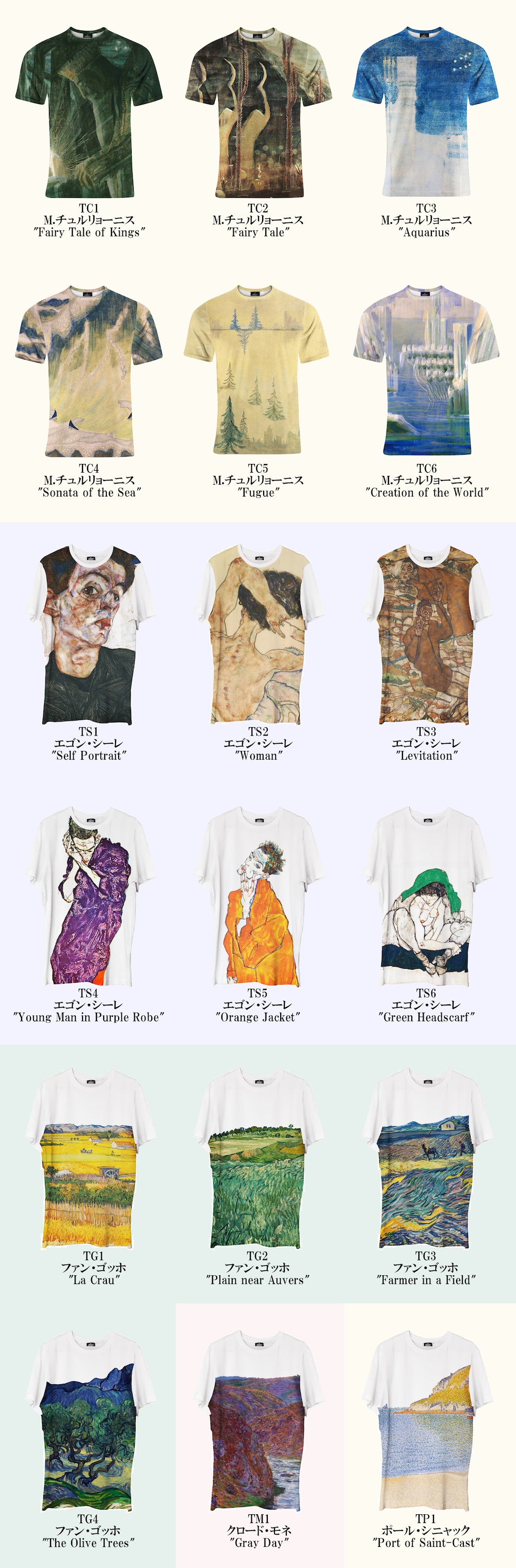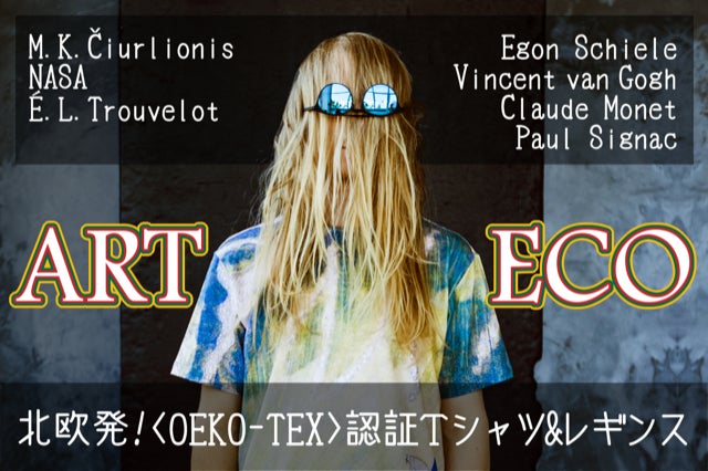 面白いアプローチの一つ目はそのデザイン。Tシャツのシリーズにはチュルリョーニス(リトアニア)の他にもエゴン・シーレ(オーストリア)、ファン・ゴッホ(オランダ)、クロード・モネ(フランス)、ポール・シニャック(フランス)といった有名画家のアートがラインナップされていて、それをデザイナーの手でTシャツにデザインすることでアートの持つセンスがそのまま活かされています。ユニセックスですので男性女性ともにお使い頂けるサイズ仕様となっています。