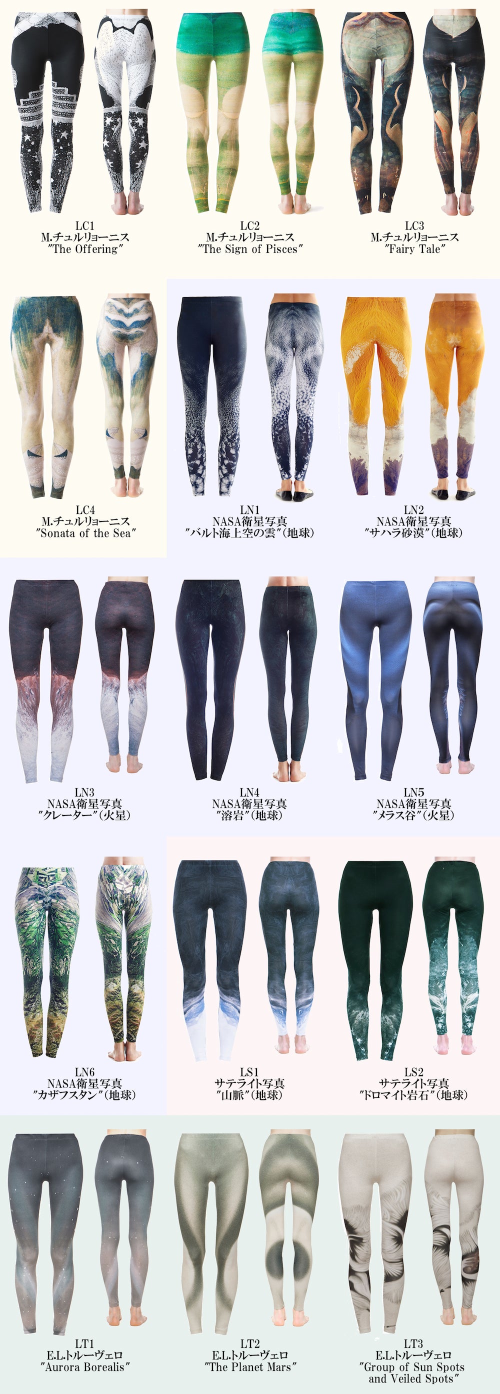 また、レギンスのシリーズにはチュルリョーニスの他に地球や火星を撮影したNASAの衛星写真、地球上空から撮影したサテライト写真、フランスの天文学者・画家のエティエンヌ・レオポール・トルーヴェロが描いた惑星や宇宙のアートをデザインした個性的なラインナップが並びます。女性用サイズになりますが、ファッションとしてレギンスを取り入れている男性の方にもオススメです。
