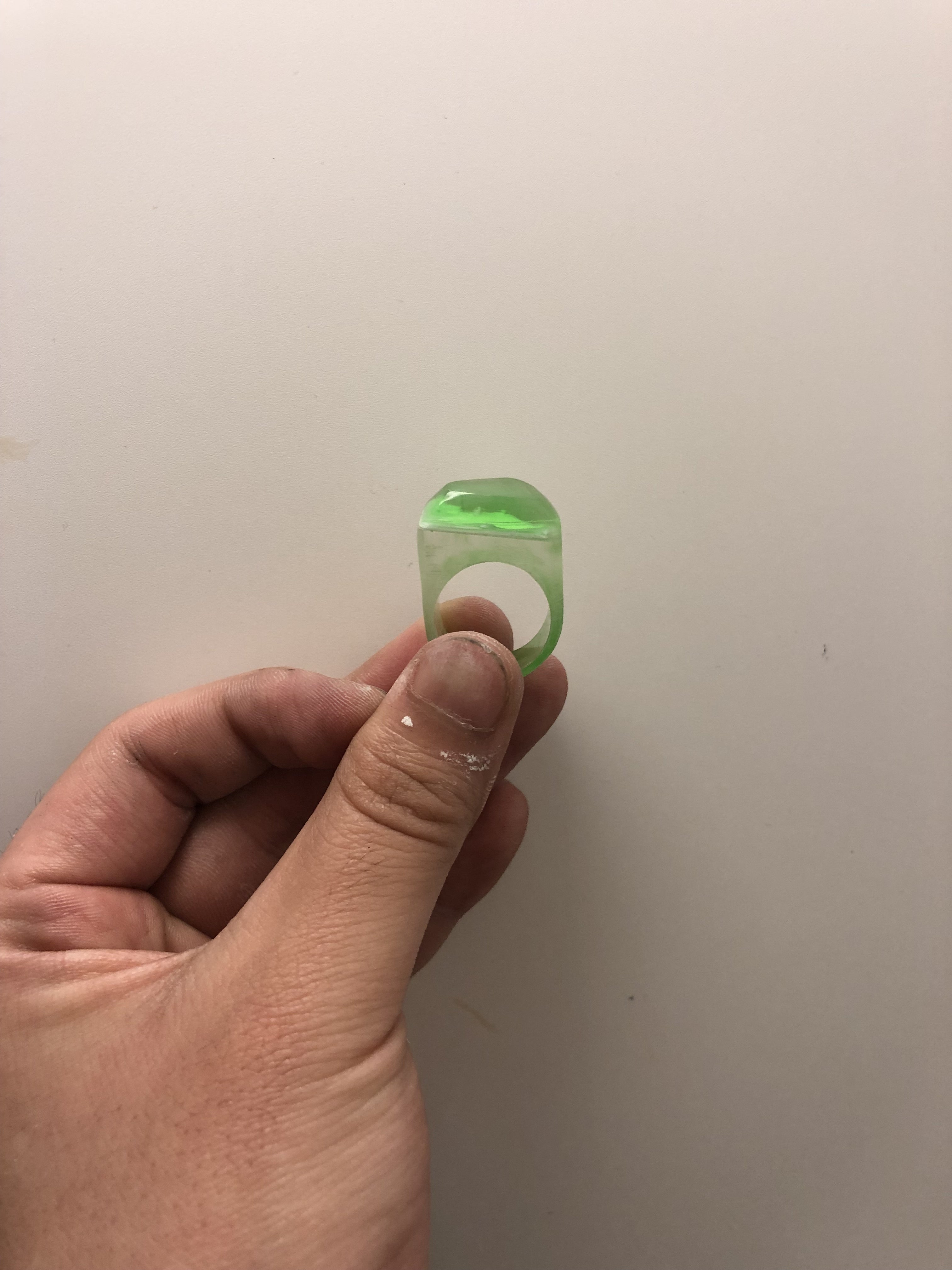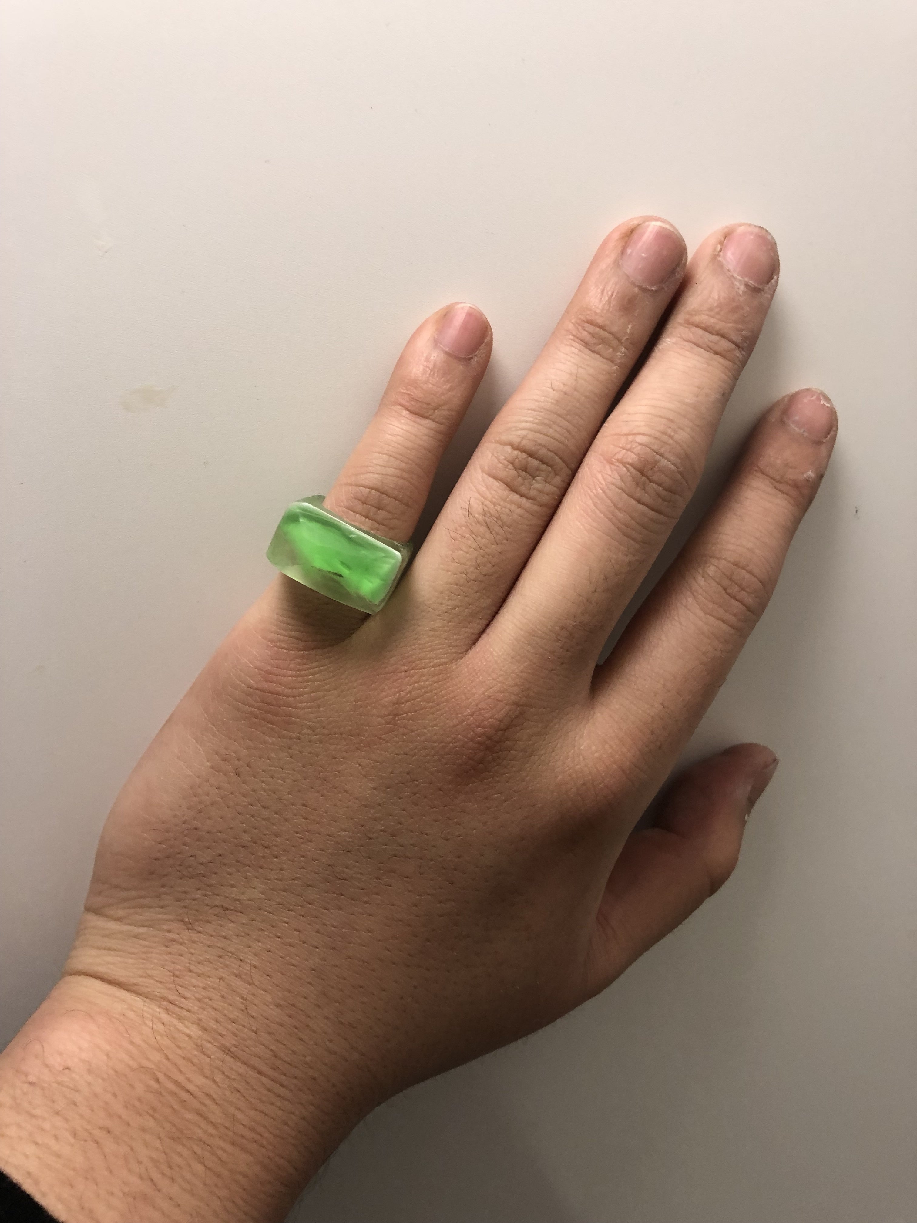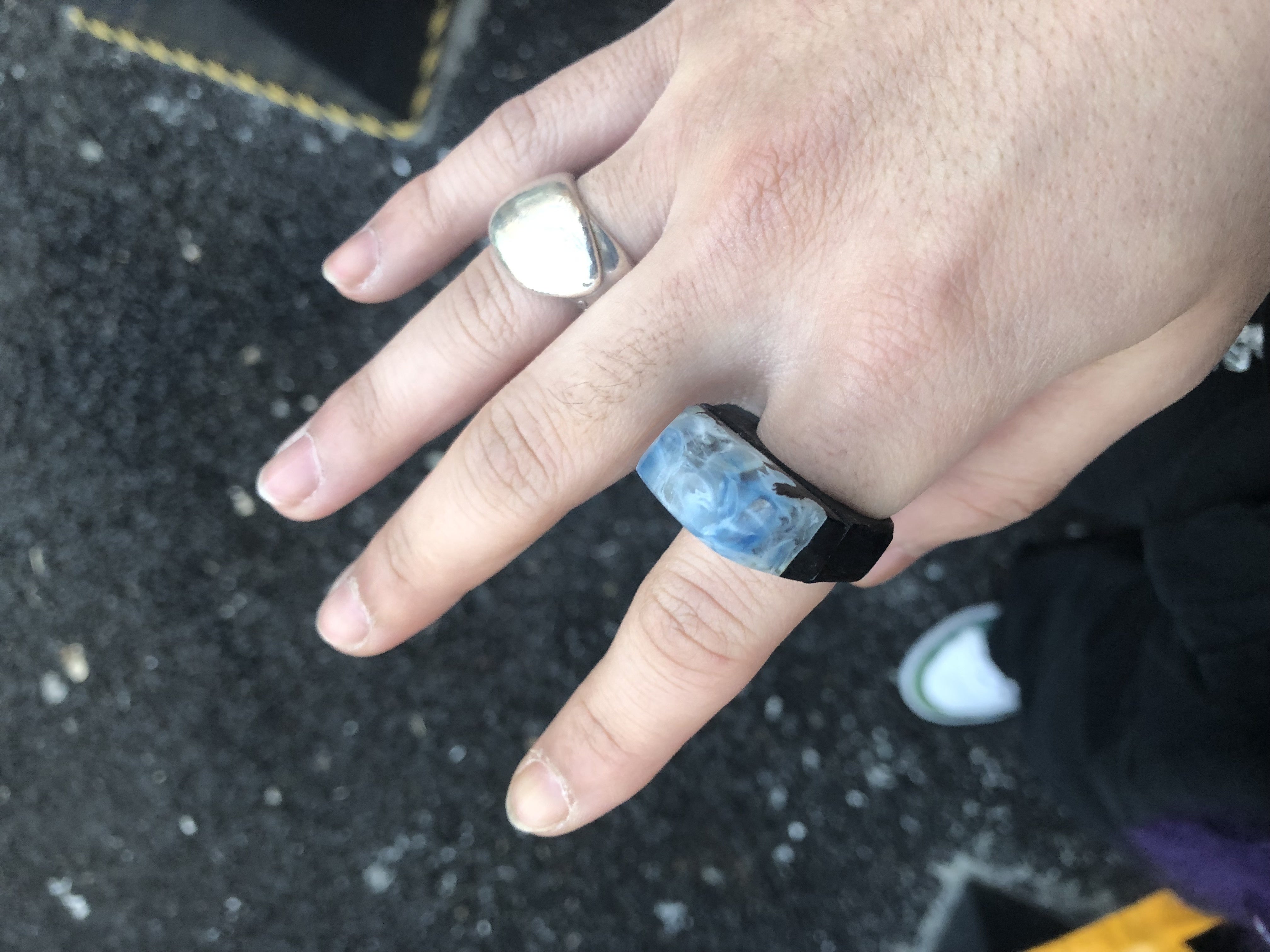 UVレジン液ではなくエポキシレジンを使用し、光沢感、重量感を増したレジンリングになります。リングの中、廃棄となったアクリルプレートを加工しリングの中に入れ再利用しております。サイズは12号になります。