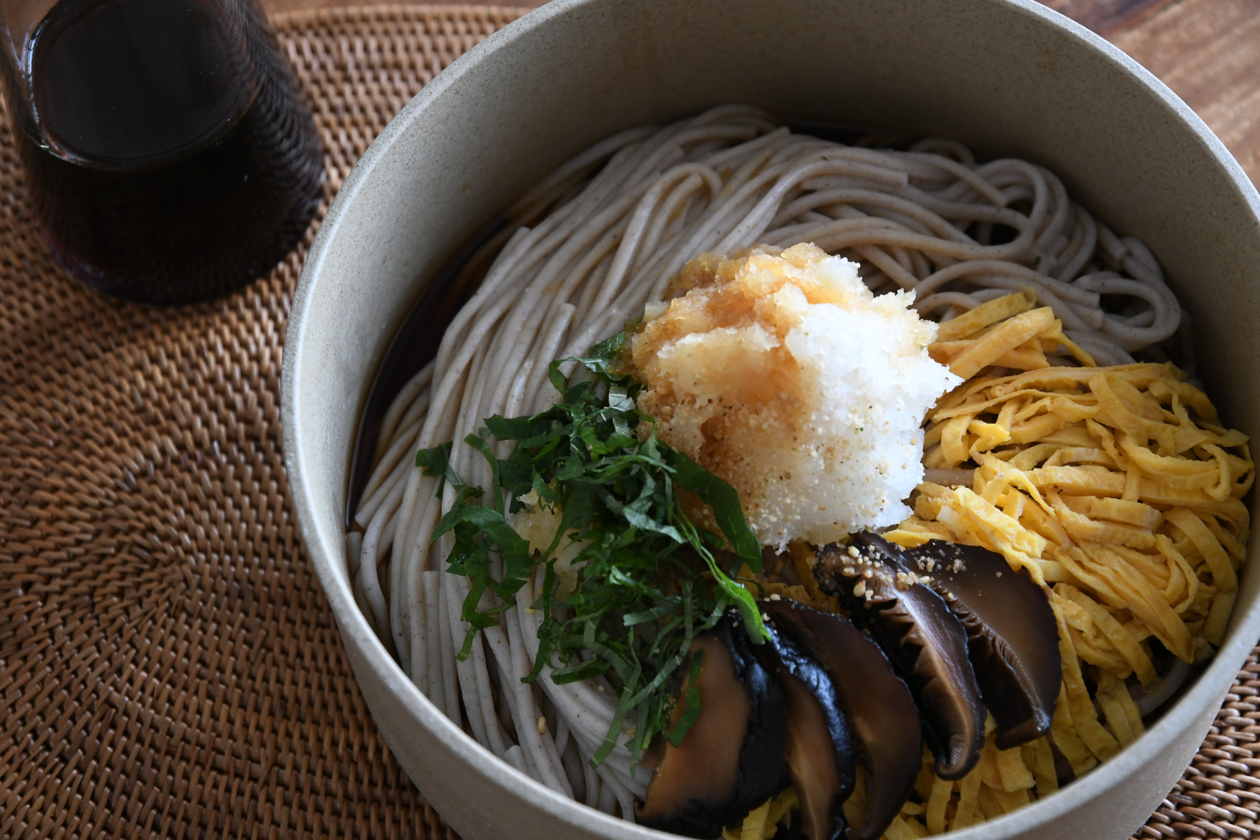 大根おろし、お好みで椎茸の甘露煮や金糸卵、大葉や小葱、すりごまをトッピングしてめんつゆをかけます。