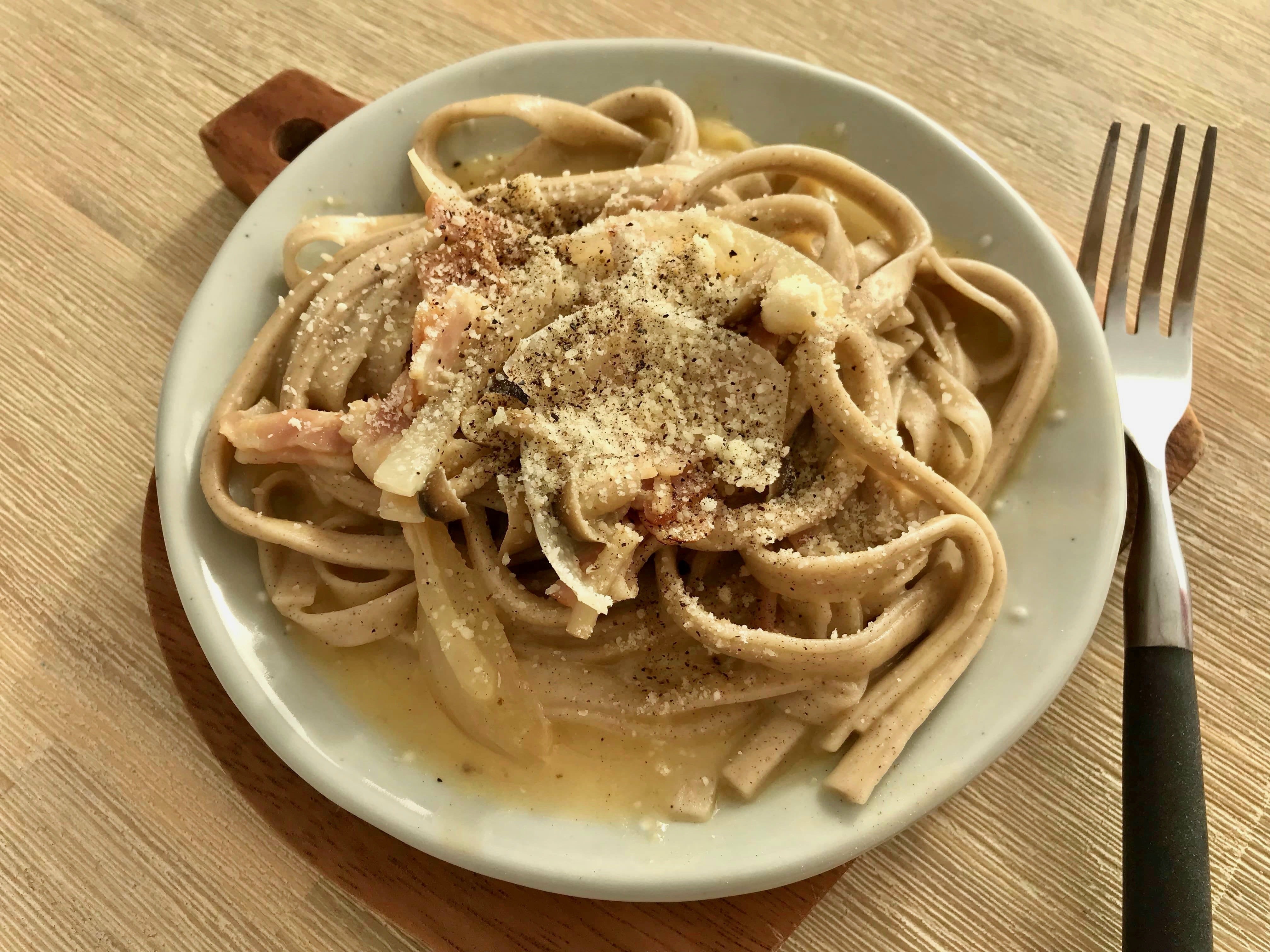 栄養価が高いこと、職人や製造者様の思い入れが強いことからゆで汁も全部食べたいと思い、ゆで汁を一滴も捨てることなくカルボナーラのスープパスタにしました。