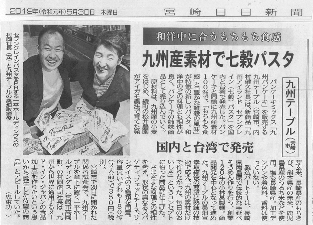 日経新聞記事「九州テーブル、地元産素材の自然派パスタ 国内・台湾で発売」https://www.nikkei.com/article/DGXMZO45323250X20C19A5LX0000/