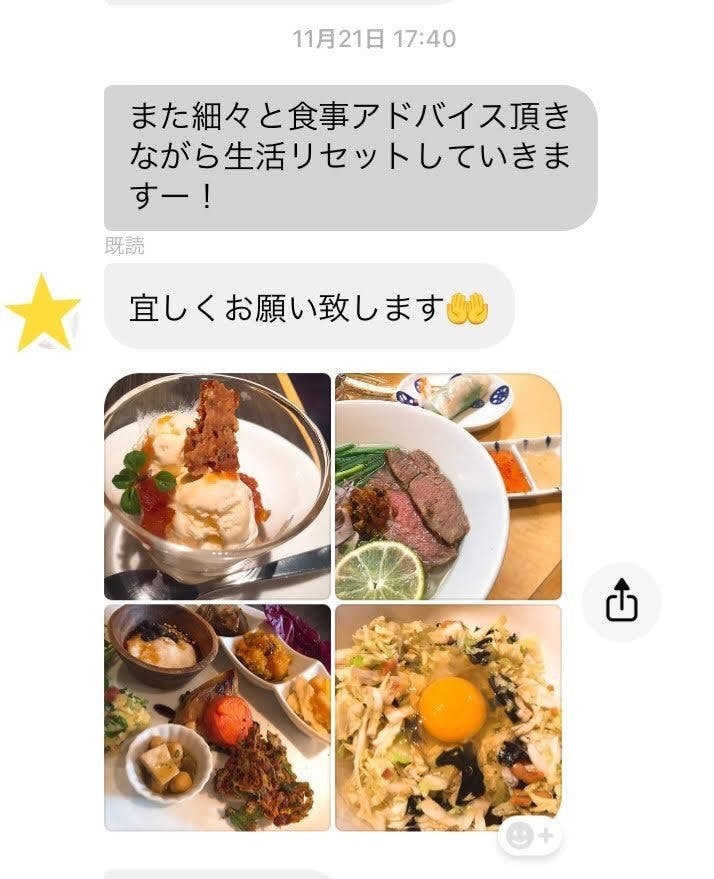 2019/04/19 16:41こんにちは!管理栄養士の水澤美菜子です。リターン品の【オンライン栄養カウンセリング】について、実例を交えてご紹介いたします。まず、「管理栄養士に食事を見せること」これはとてもハードルが高いことだと思います。自分の習慣や、嗜好、食への意識、食費への考え方、だれといつ食事しているのか・・食事のお写真1枚に、その方の情報がたくさん詰まっています。カウンセリングの際は、そのお写真を大切に扱わせていただきます。今回は許可をいただきましたお客様と私のやり取りをご紹介します。外食、もちろんしていただいてOKです!私は、カロリーについてはあまりお伝えしません^^ご覧のように、食べるタイミングや、組み合わせでちょっとマイナスすると良いものをお伝えします。この方はむくみも気になるお客様なので、塩分をカットする提案をしました。コンビニでお昼を買う方も多いですよね^^選び方のコツもアドバイスさせていただきます。食欲が止まらない~~という女性ならではのお悩みもありますよね。ここには登場していませんが、ローカロリーでダイエット中の間食にも安心な食品をご紹介することも。このように、前後のお食事や、間食の有無なども含めてアドバイスさせていただいています!食べ過ぎても、調整の仕方を一緒に考えていきます。「食べ過ぎです!!」「〇〇はやめましょう」などの禁止ワードは基本使いません^^管理栄養士、怖くないですよ。笑ご自分の食生活を見直すパートナーとして、ぜひ管理栄養士へご相談くださいね。水澤美菜子管理栄養士/妊産婦食アドバイザー もっと見る