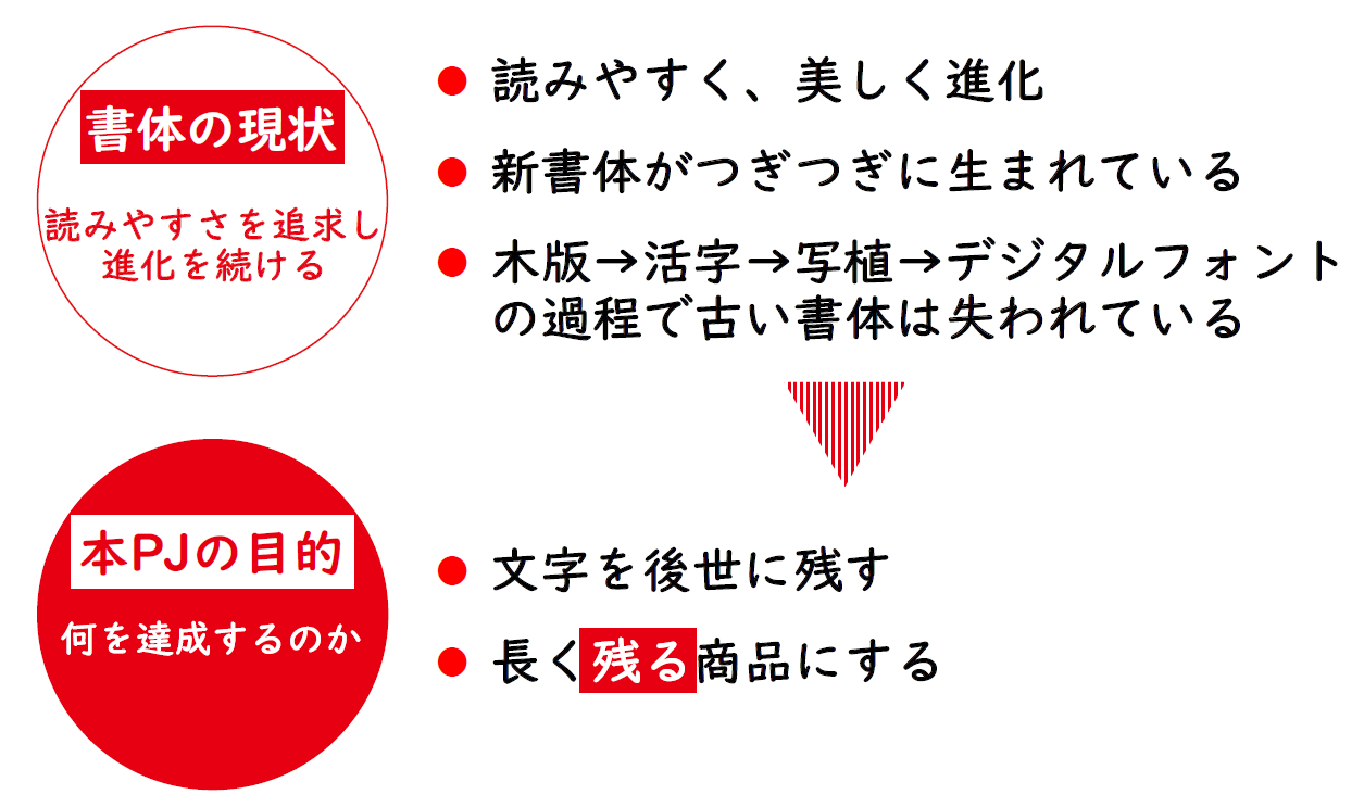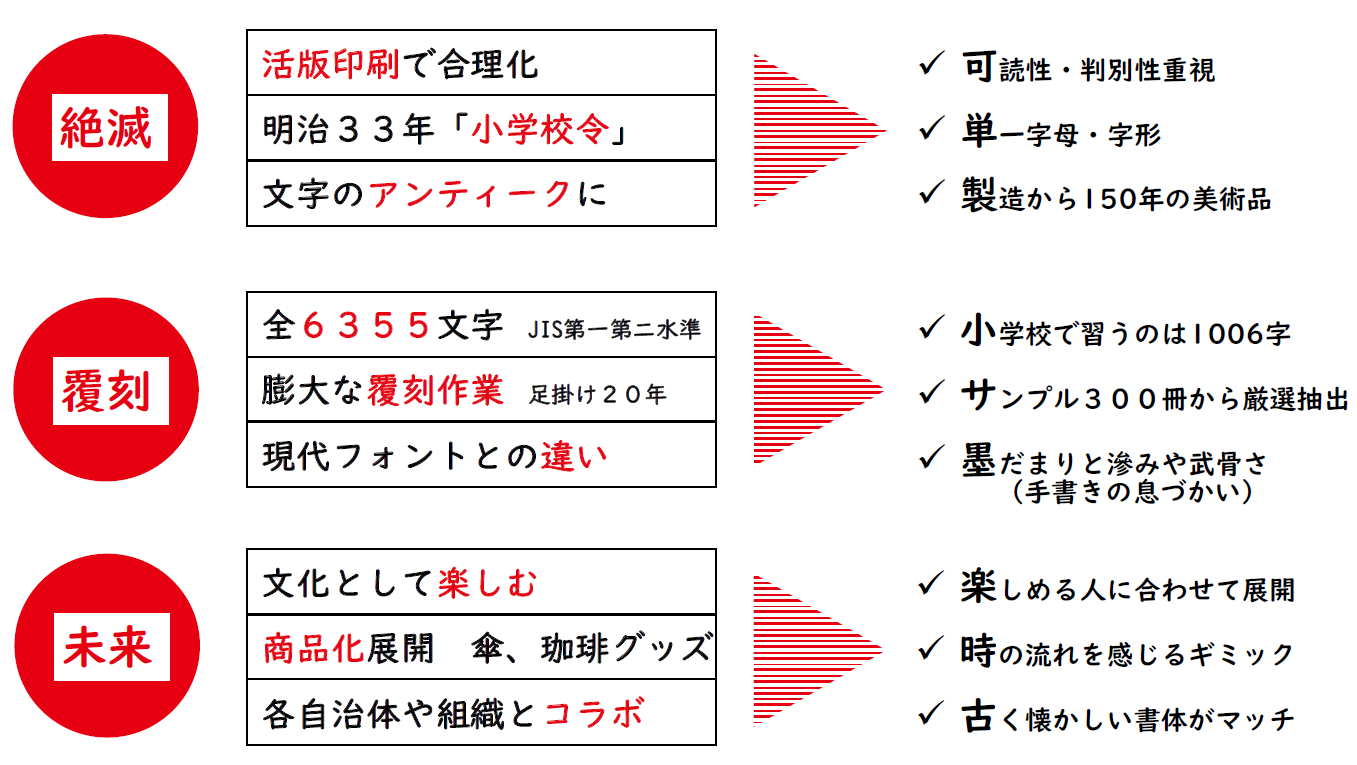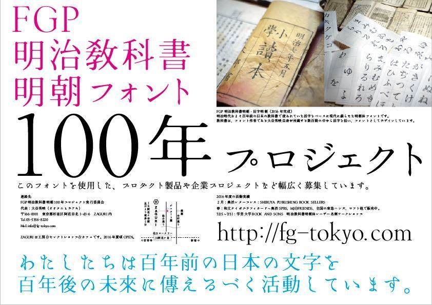 この文字は単なるフォントパッケージとしてではなく、教科書歴史資料、活字の成り立ちをも含めた文化、「100年プロジェクト」として考えており、明治教科書明朝展示やワークショップなどいくつかの活動を始めています。