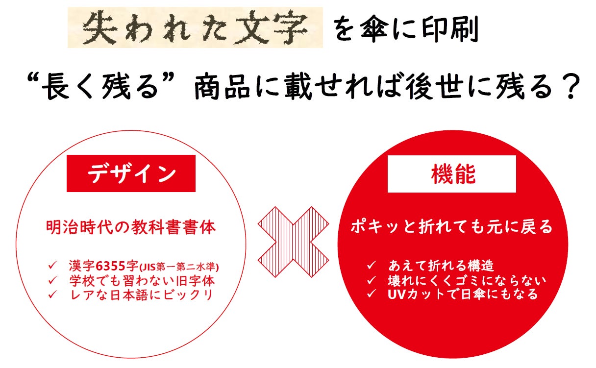 ”長持ちすることで次世代に良い環境を残す傘”に、”絶滅の危機にある「文字」” を印刷することにより、文字を後世に残していくという本プロジェクトをよろしくお願い致します。