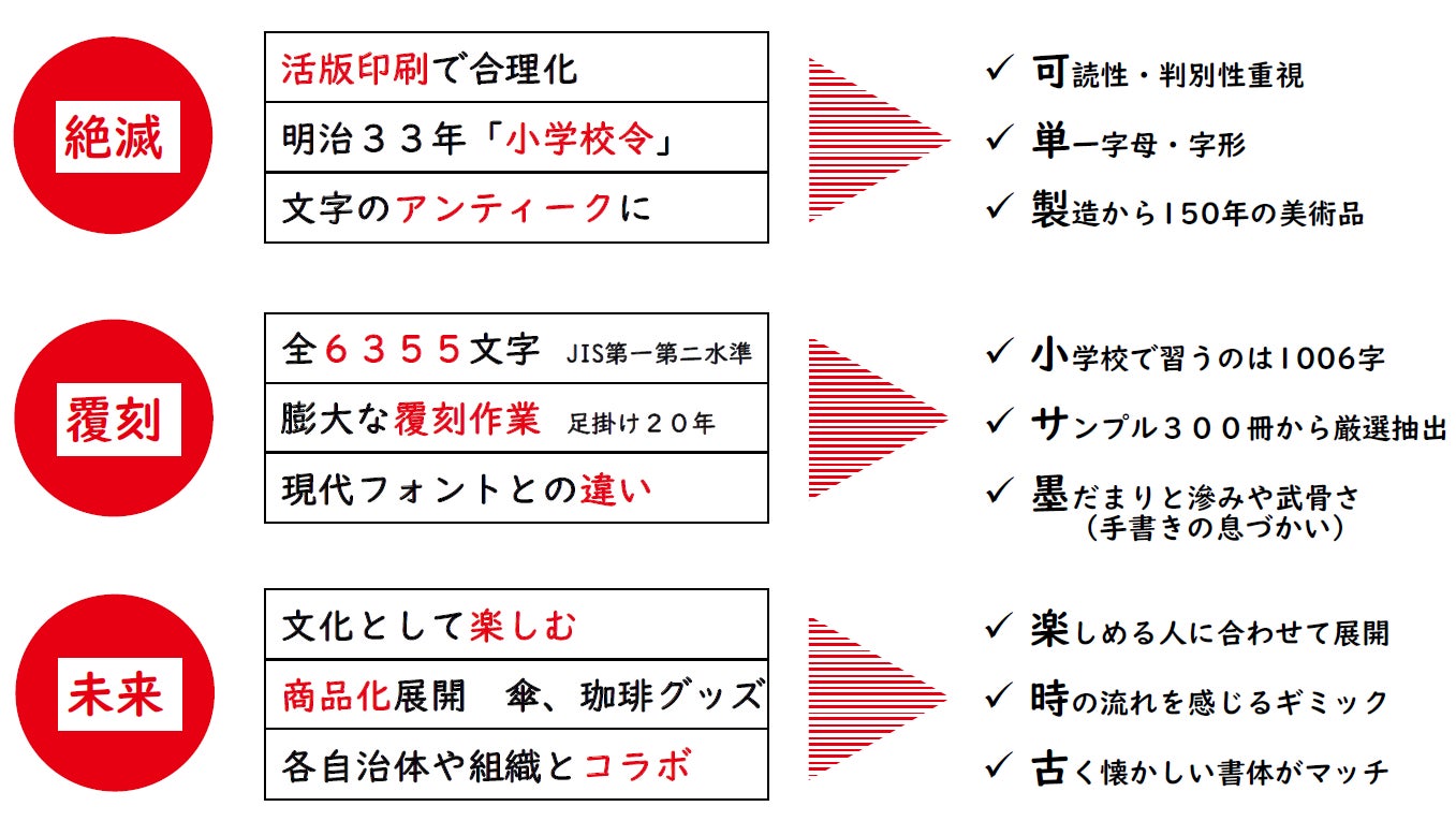 百年以上前の書物に触れその活字の美しさに魅了され、滅びてしまった活字を百年後の未来に残したいという強い思いからデータ化されたフォントです。明治期の教科書活字をもとに基本に忠実にレタリングし、現代流にデザインして蘇らせました。
