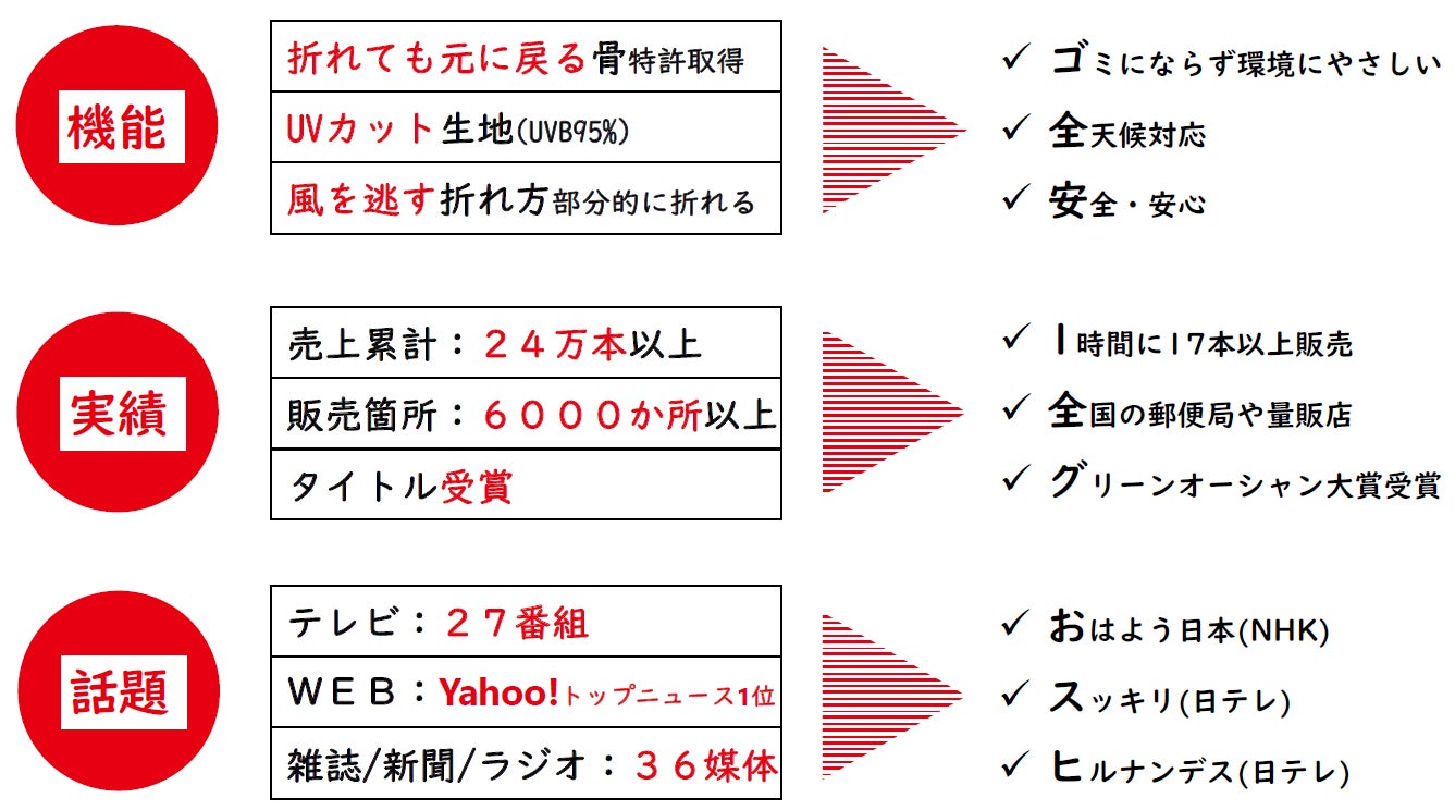 2017年6月に販売を開始して、21ヵ月で24万本以上を売り上げている傘です。使い捨てのビニール傘のゴミが環境に与える悪影響を軽減するような傘として開発されました。その特徴は”折れても元に戻る”構造です。あえて折れるという逆転の発想で話題になり、各種メディアに取り上げられています。