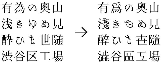 該当するユニコード漢字を入れ替えているため、逆に旧漢字で入力すると新字体となります。また、しんにょうが二点しんにょうに、「工」、「世」などのいくつかの漢字を異体字として作り、計450字以上にのぼる漢字を旧字・異体字としてフォント化しています。