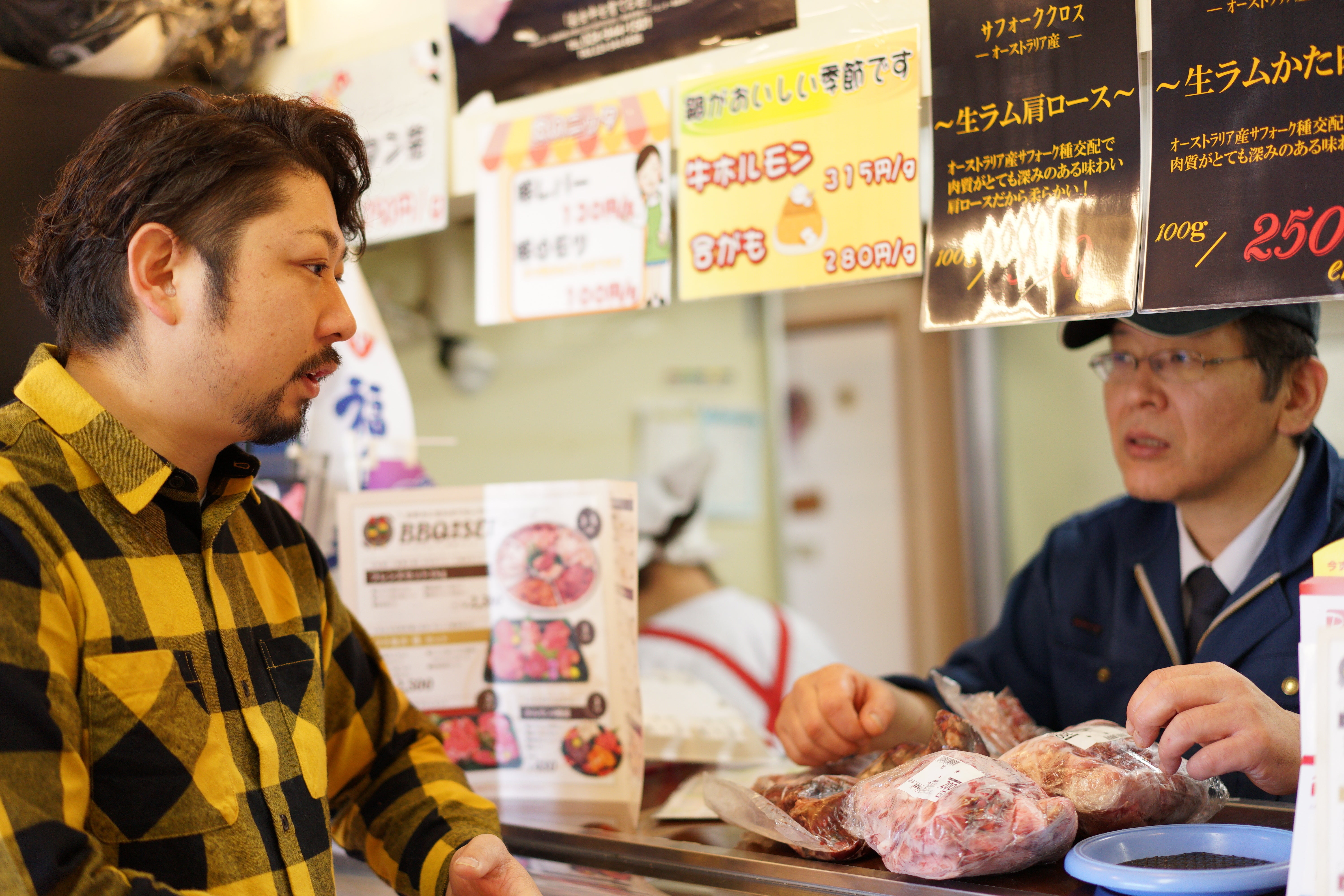 〈 ↑ 地元のお肉屋さんでの仕入れの様子〉