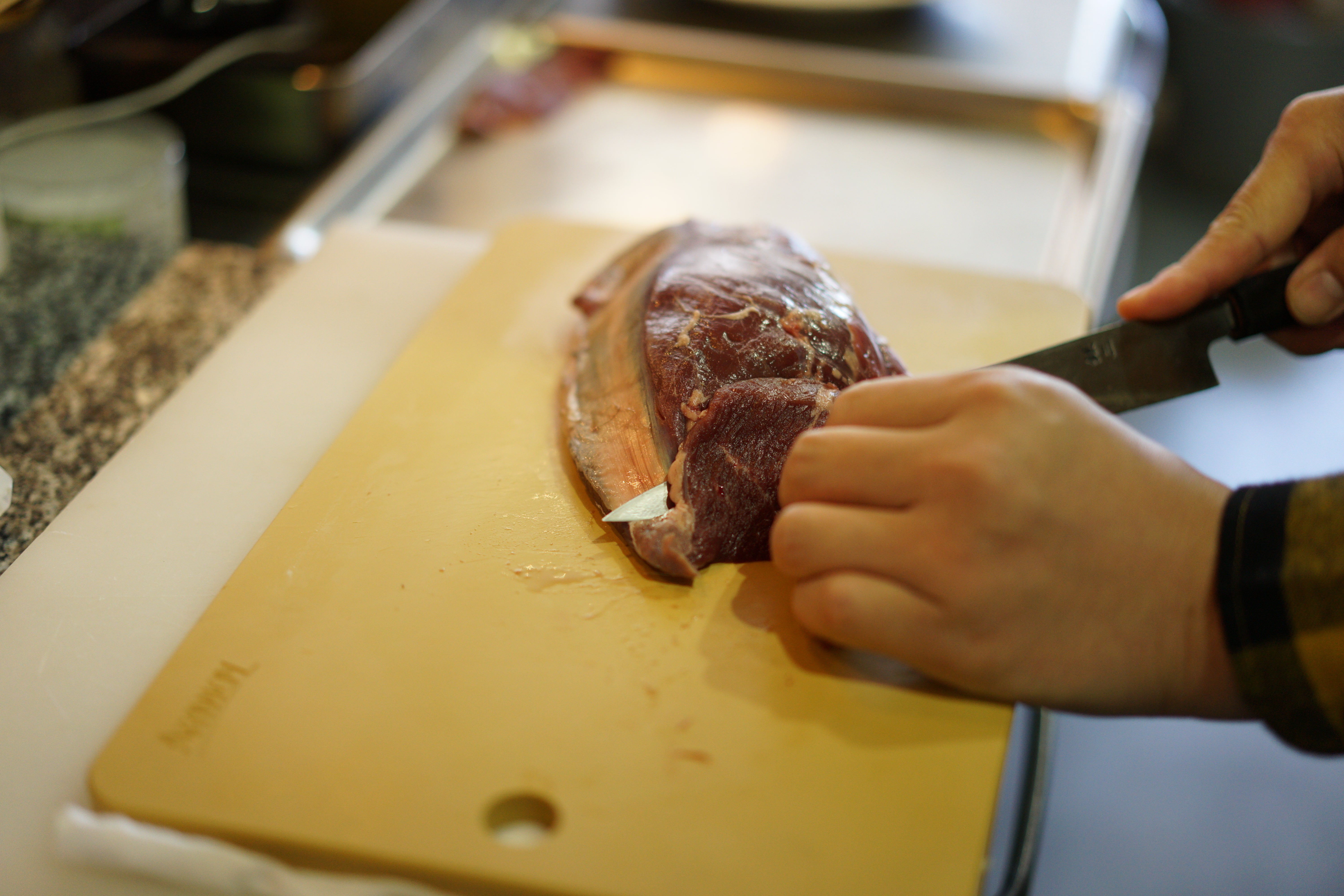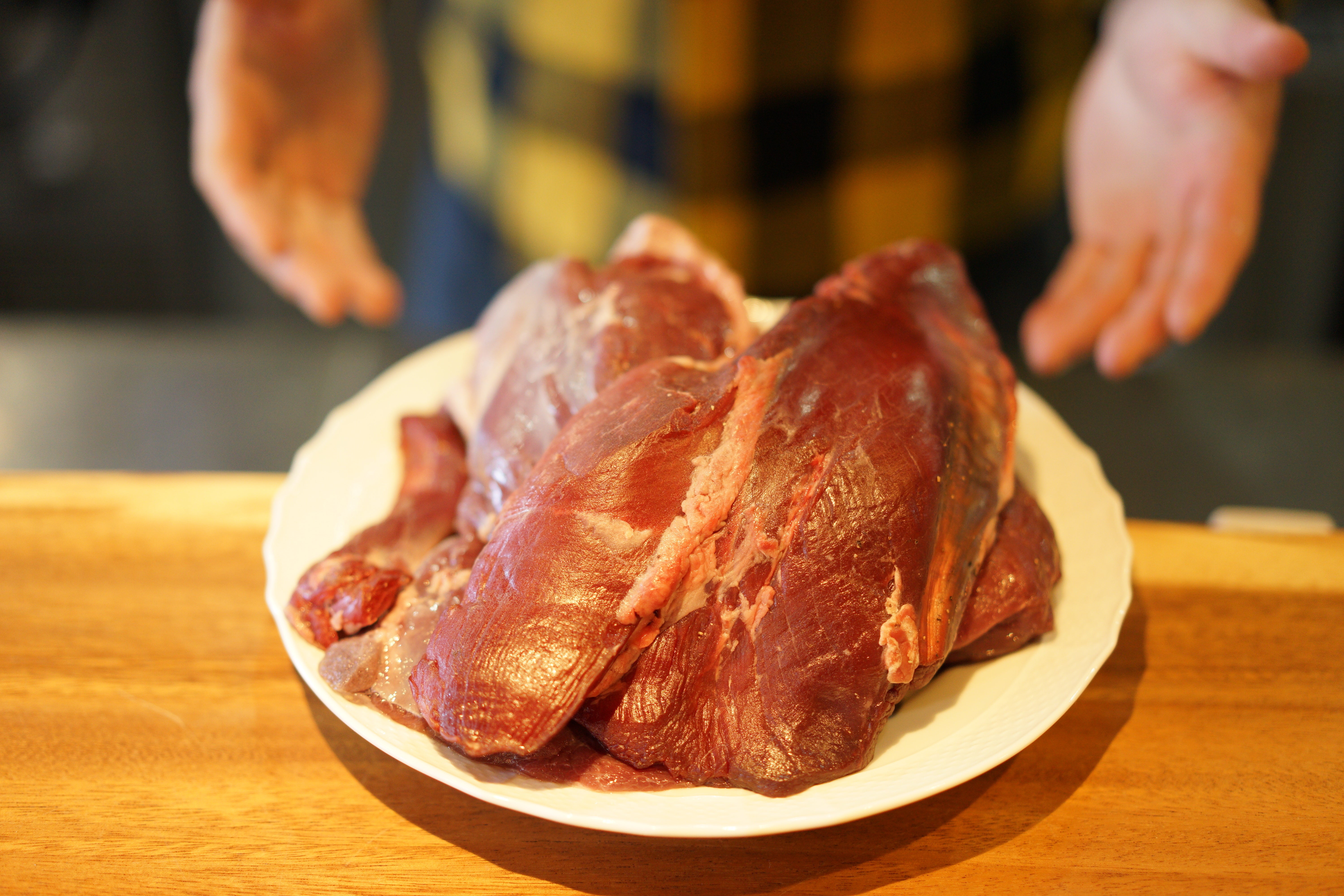 鹿肉やイノシシ肉のジャーキーです。切ったお肉をコンベクションで乾燥させて作ります。人が食べることもできる、安心で安全なジャーキーを開発中です。(※写真は鹿肉です)<生の鹿肉>