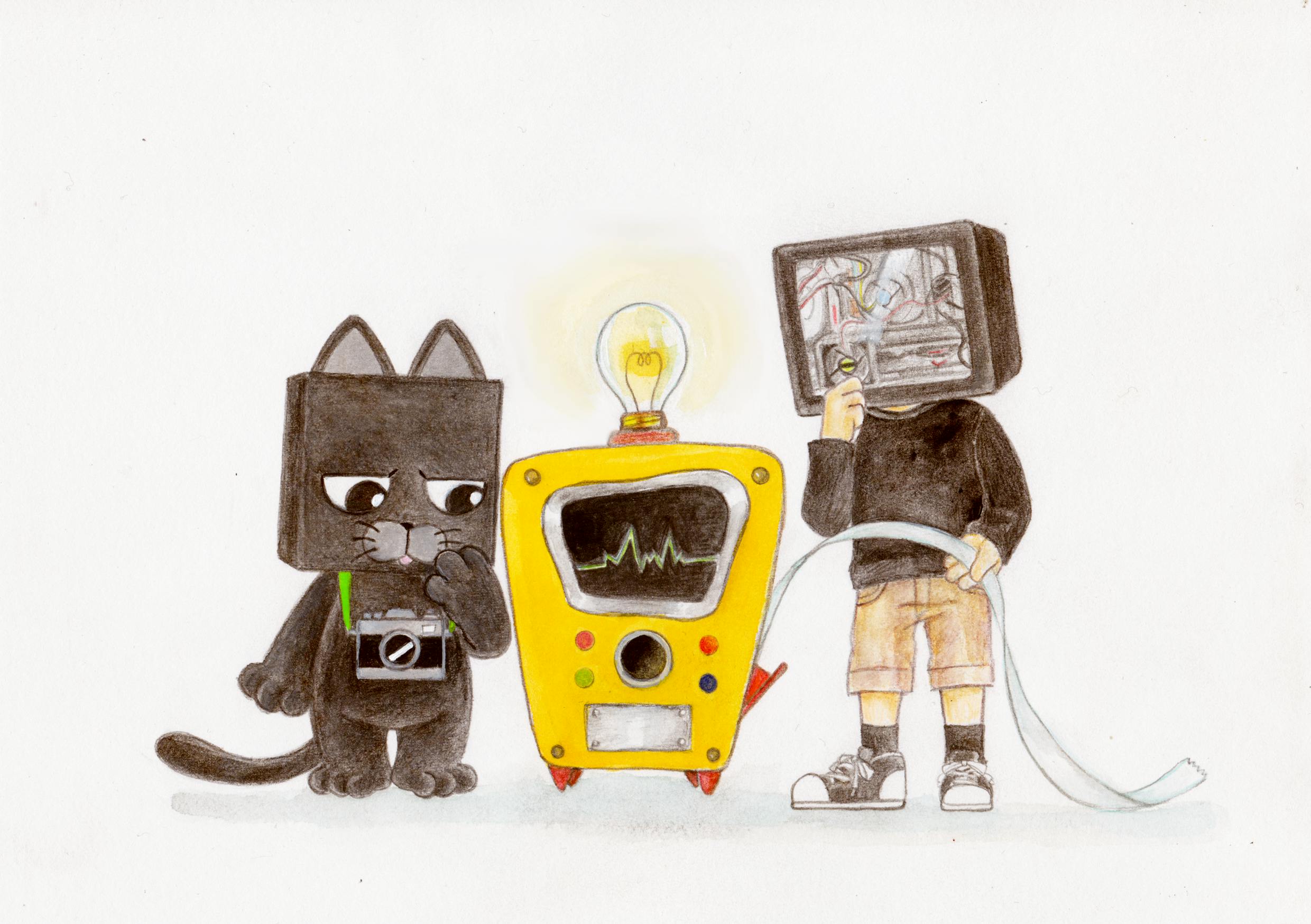 絵本の内容はプロジェクトメンバーの石井さん(保育園園長)と「読み聞かせがしやすい」ものにしますが、背景イラストや絵本の中でキュイが発明するグッズは実際に存在する最新テクノロジーを駆使したものが描かれます。