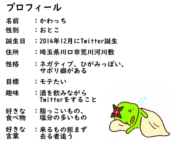 設定では荒川河川敷に住んでるカッパ型のモンスターで埼玉県川口市の非公認キャラってことになってるっち。普段は主にTwitterで愚痴を言ったり酔いつぶれたりしてるっち。