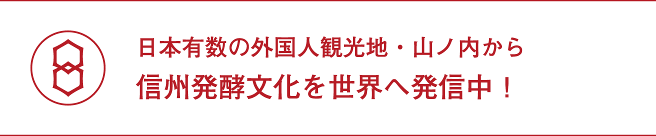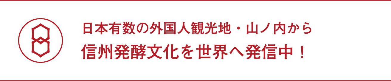 県内外はもちろん各国から山ノ内へ観光に来た方で日夜賑わう『HAKKO(ハッコー)』。その店舗名は、長野県で昔から続いている “発酵食品” “発酵文化” をインバウンド客で賑わう山ノ内から世界に向けて発信したい!という願いから名付けられました。