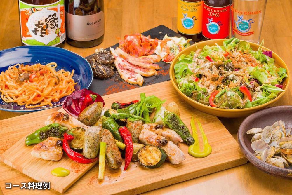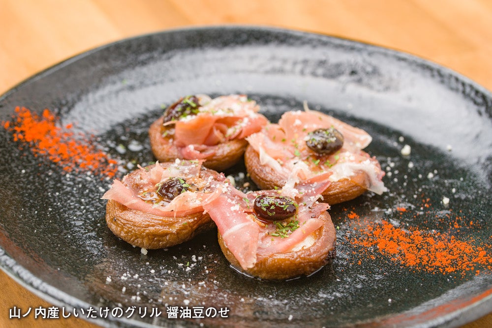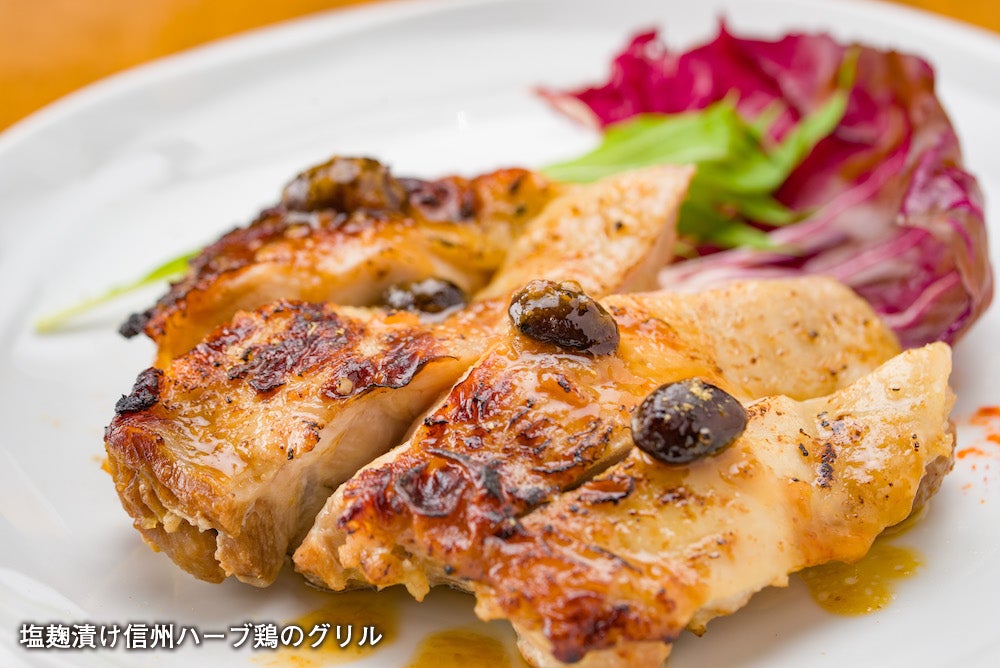 長野の銘柄鶏を地元の塩麹でマリネした『塩麹漬け信州ハーブ鶏のグリル』や、山ノ内産のしいたけと地域の郷土食である醤油豆を組み合わせた『山ノ内産しいたけのグリル 醤油豆のせ』など、発酵食品と地域の食材を掛け合わせた料理を提供しています。