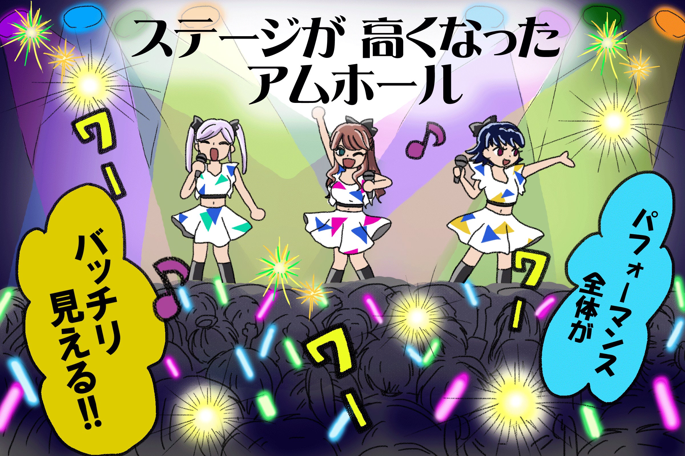 アムホールのステージ高を上げ、お気に入りのアイドルのパフォーマンス全体を楽しめるようにするため、