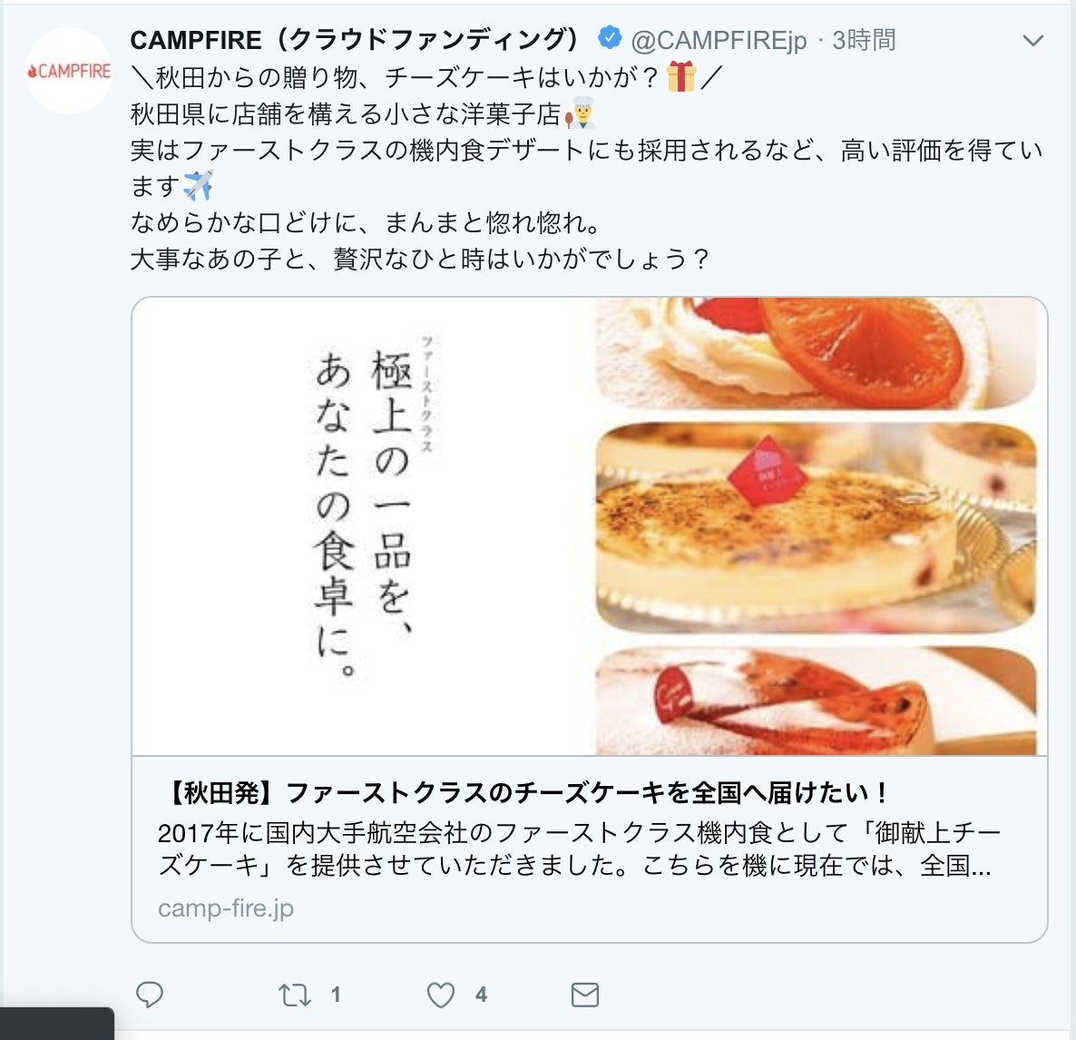 なんとキャンプファイヤー さんが、当店のプロジェクトをツイートしてくれました。ありがたき幸せ!残り5日間頑張ります!