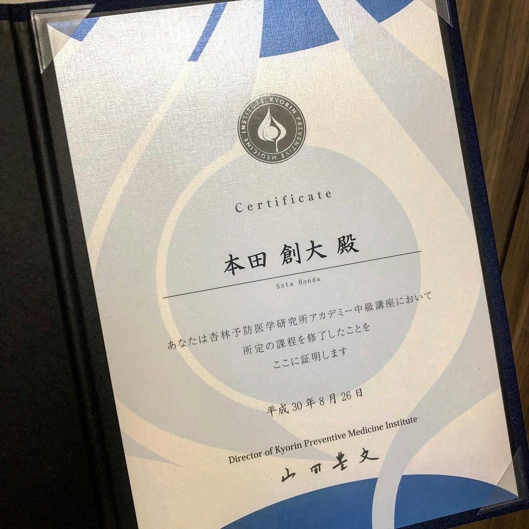 2018年8月:杏林予防医学研究所アカデミー中級講座修了(大学3年次)