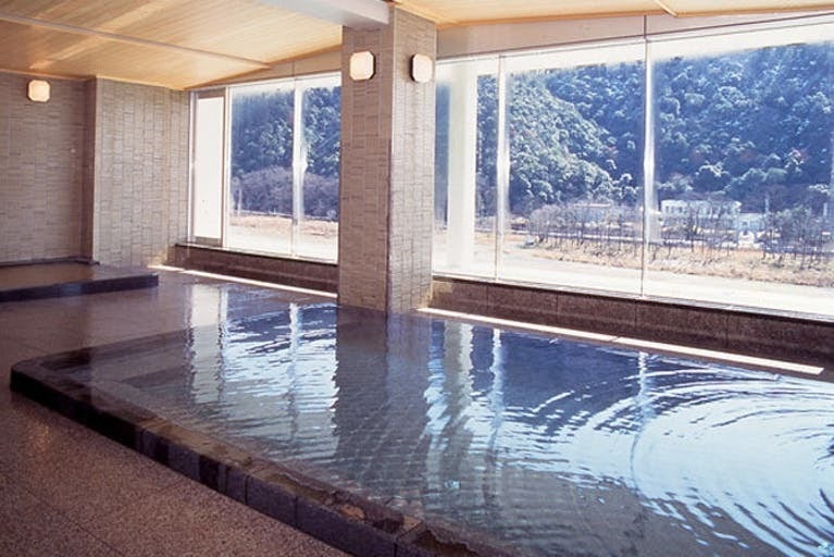 窓の外に川と山が広がる温泉。写真:長良川温泉旅館「鵜匠の家 すぎ山」