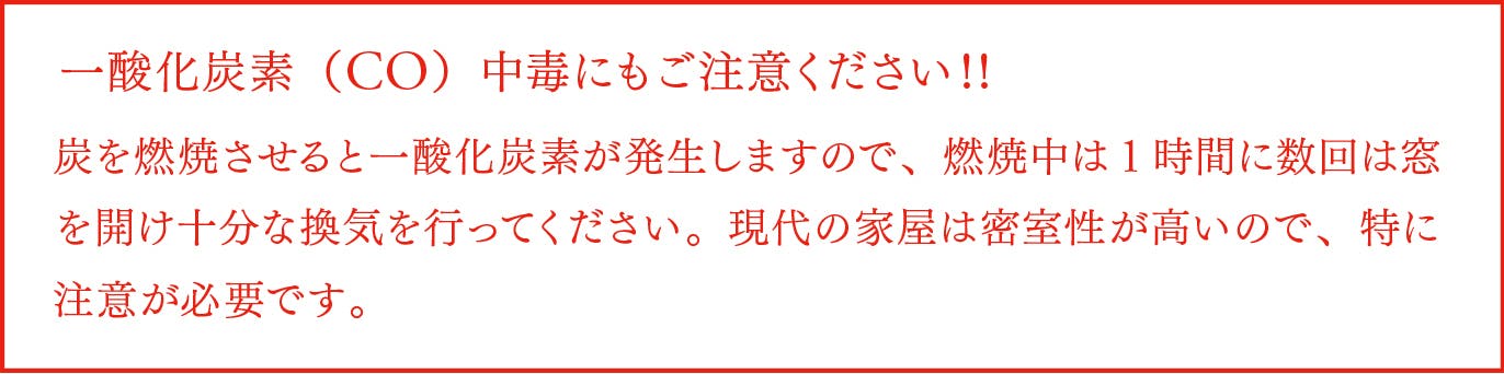 ※使い始めの時期に、燃焼中の炭と触れると黒染め特有の匂いがすることがありますが、健康上は問題ありません。また使っていくうちに匂いはなくなっていきます。