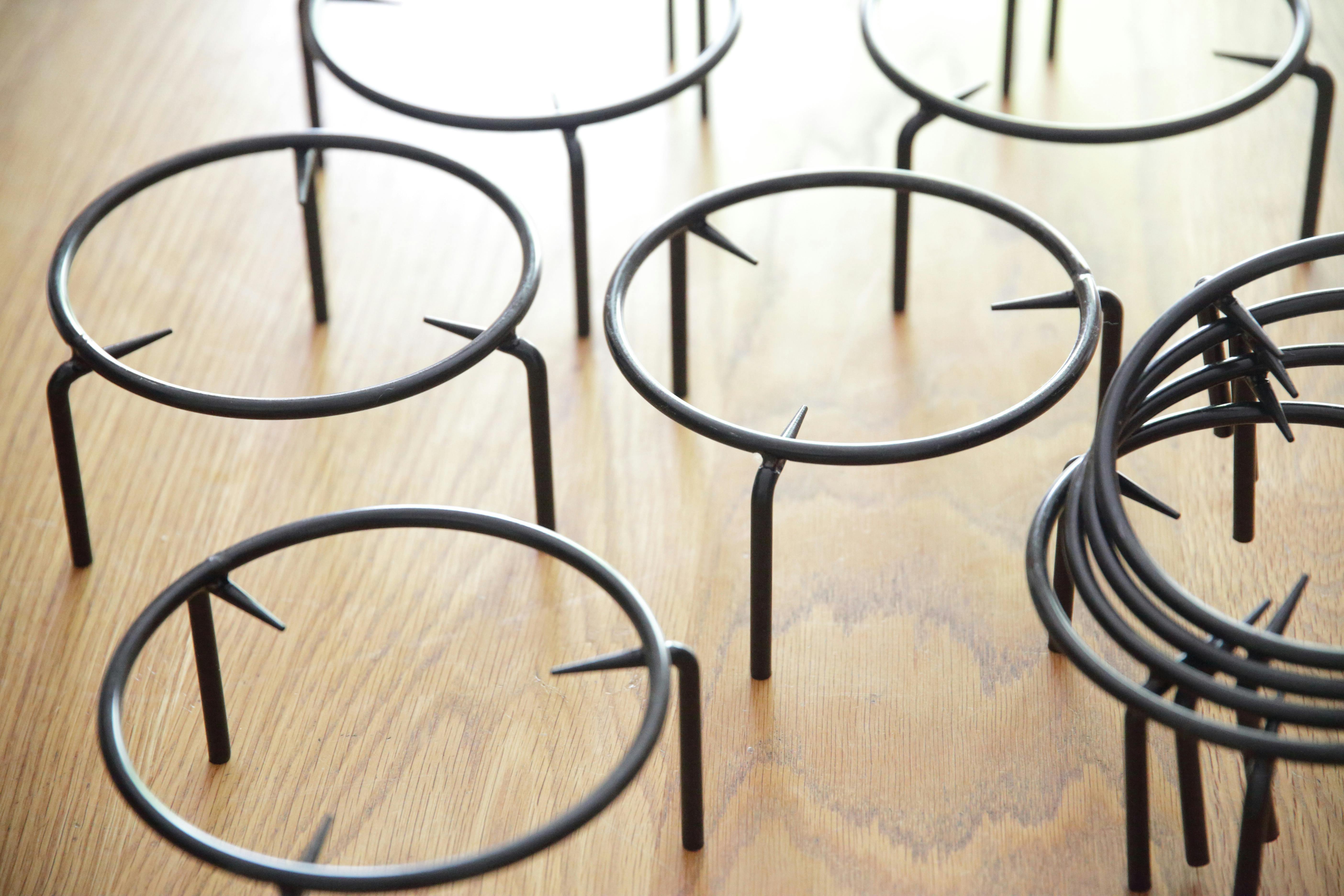 余計な要素を削ぎ落とし、シンプルに仕上げています。金属加工の歴史が長い新潟県燕三条にある製作所に依頼しました。脚上部を内側に折り返していますので、リングの口径145mmより小さいものも乗せることができます。こちらも火ばしと同じく、黒錆で表面を仕上げております。