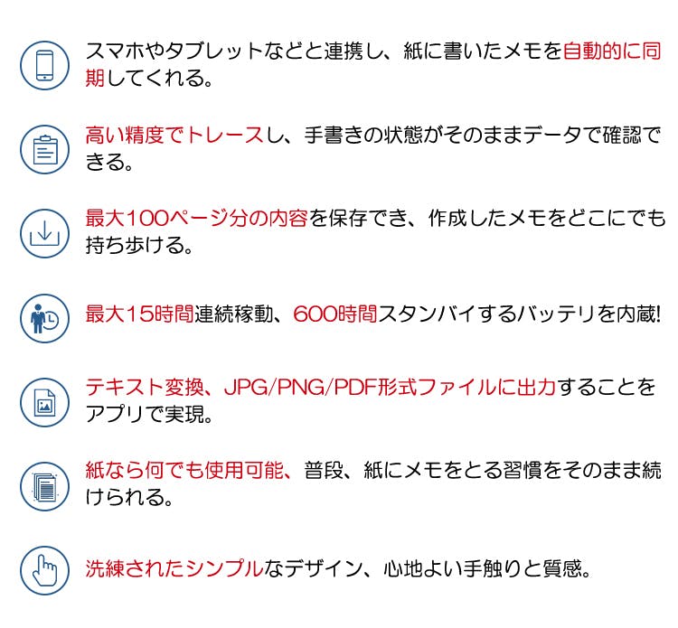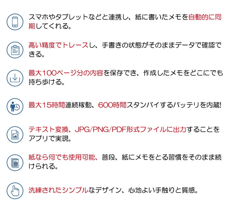 普通のノートでも、付箋でも、どんな紙も使えるのがポイントです。使いやすい、専用のボールペンでアナログ感覚でご使用いただけます。