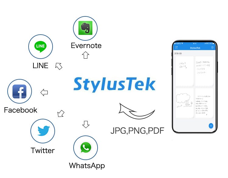 A:StylusTekアプリを通して、それぞれ任意のページを結合したり、文字認識、PDF・JPG・PNGに簡単変換、SNSに投稿やシェアすることもできます。ユーザーの発想をサポートするために、ペンで書いた線の色を選択可能し、アプリで手書きメモや絵を描くなどの機能も備えっています!