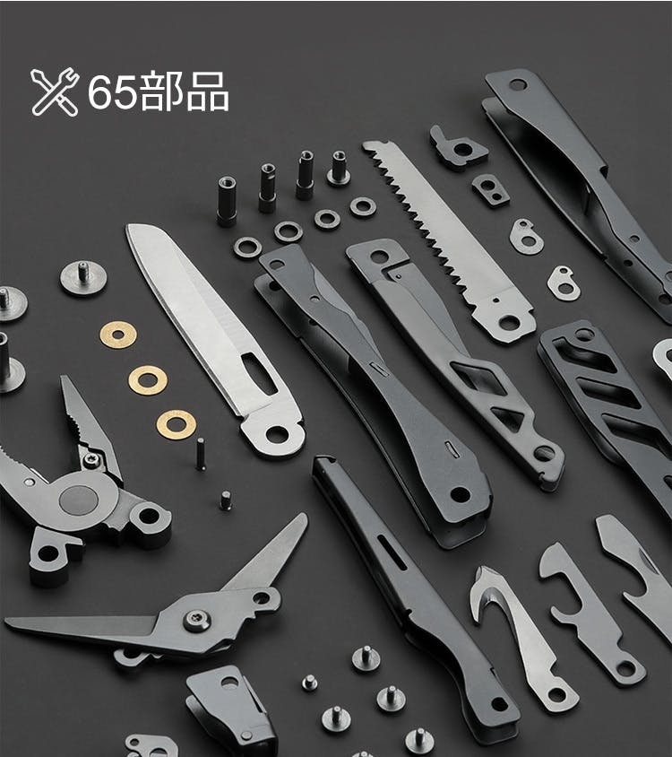 こんなにコンパクトなボディに65個もの部品が組み込まれ、それらを一つ一つ隙間無く正確に組み上げることで、立体的で美しい表情を持ったマルチツールが完成いたしました。