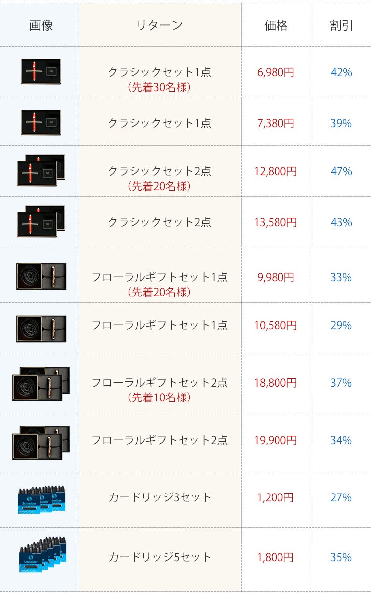A:万年筆は欧州共通規格カードリッジなら使用できます。また、本製品はドイツSchneider社の欧州共通規格カードリッジ(6本、ブラック)を付属しております。大変お得なカートリッジのみのプランもご用意しております。さらに、プロジェクト終了後には、ECサイトで販売を予定しています。別途ご案内いたします。