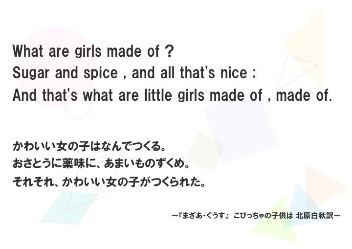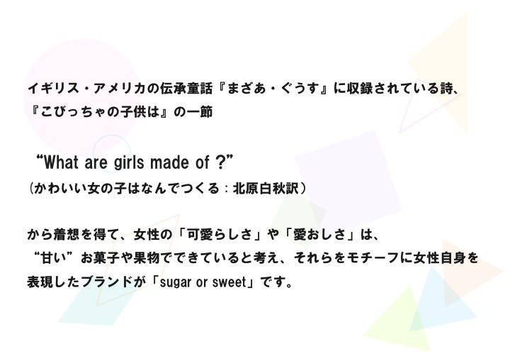 『まざあ・ぐうす』収録『こびっちゃの子供は』からの一節にあります、"sugar and spice" からインスピレーションを得て、お菓子や果物をモチーフにしていることから、"甘い"という言葉をより強調したいと考え、「甘いもの、もしくは甘いもの」としてsugar or sweetと名前をつけました。
