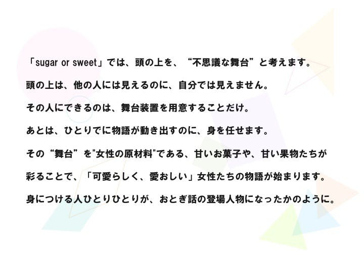 女性の可愛らしさや愛おしさを甘いお菓子や果物で表現したブランドが「sugar or sweet」です。