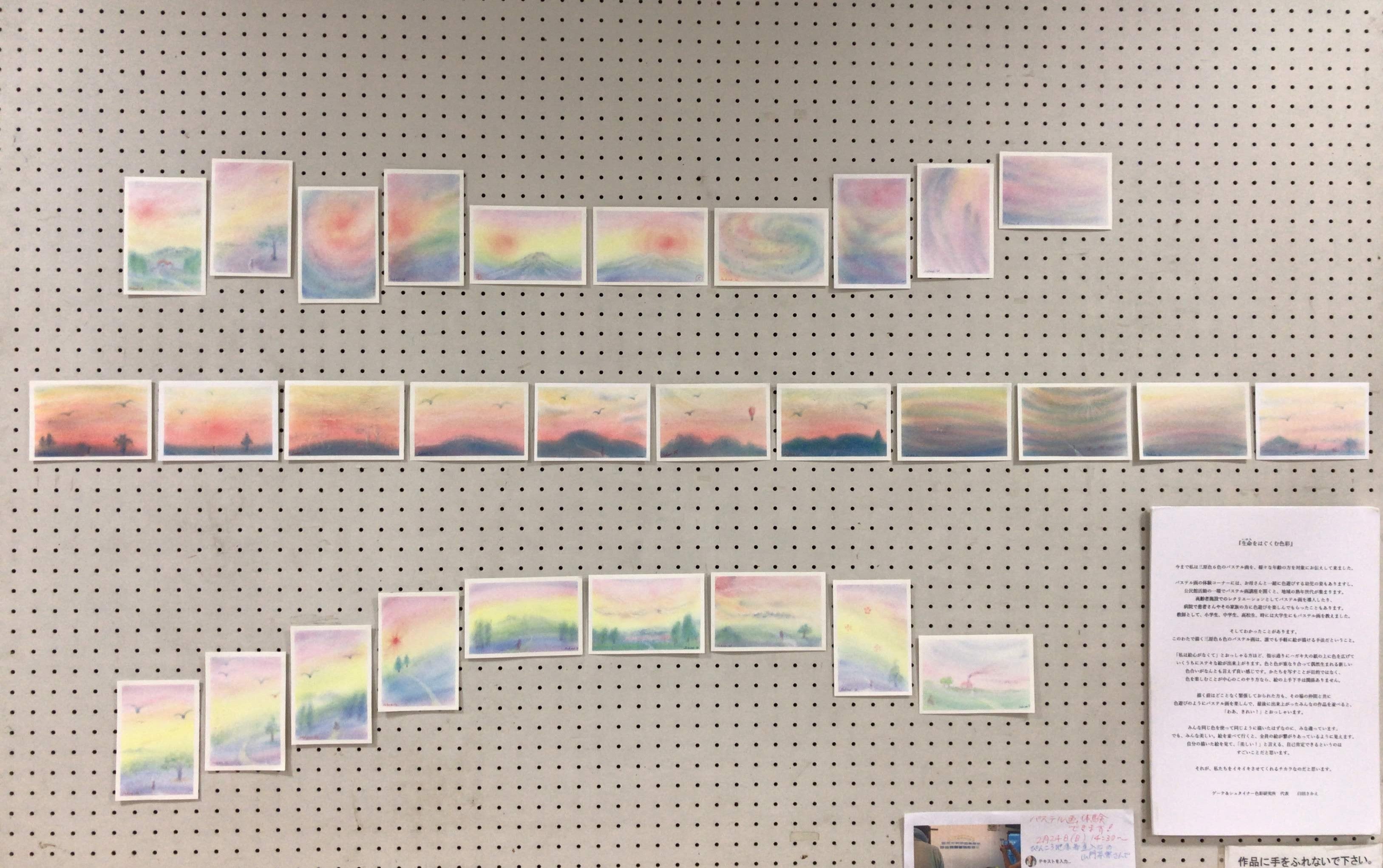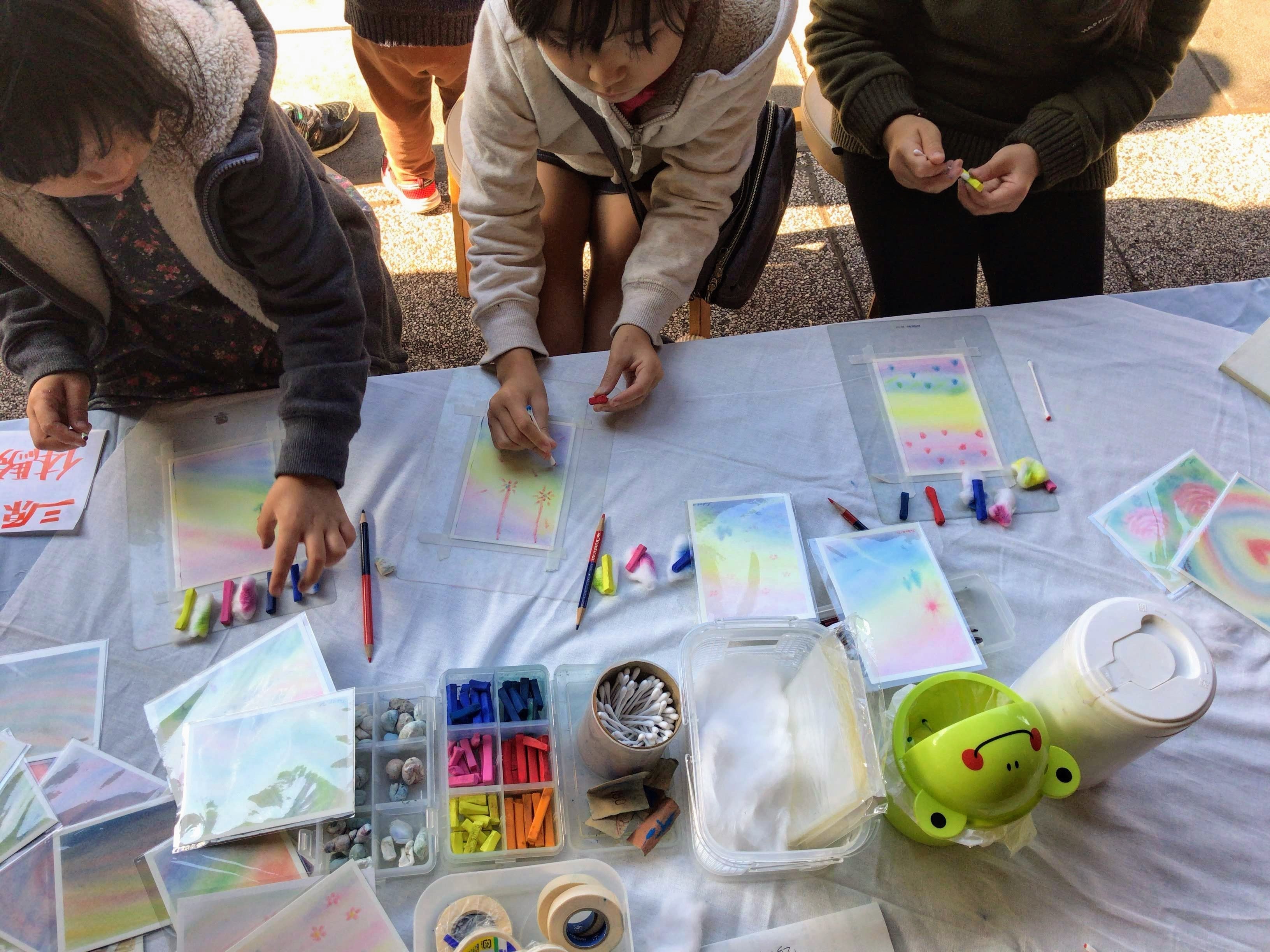 活動報告書と共に、シュタイナー教育に基づく三原色のパステル画で描いたカードでお礼状を差し上げ、こどもひろば実施時にご招待、パステル画体験を提供いたします。おいでいただく日によって、焼き芋大会やリース作り、クリスマスカードや年賀状作り、などにもご参加いただけるでしょう。