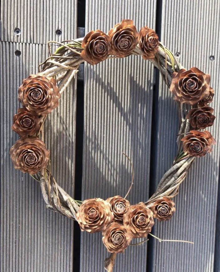 広場のヒマラヤ杉松ぼっくりでリース作り