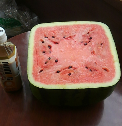 「四角い西瓜」信州ハイランド高原で栽培できる四角い西瓜は50個までと限定されています。 糖度15%以上 重量3、5キロ 縦横寸法210mm以上となり、 主に観賞用として高額取引されています。