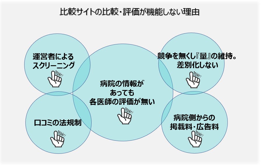 ⇒病院情報サイト(比較サイト)は複数ありますが比較や評価が機能していない