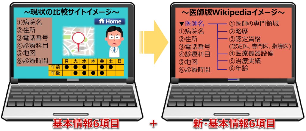 これが必要だと僕は感じました。医師には自分の健康や命を預ける訳ですから、「専門領域外の先生に治療して欲しくない、新しい医療機器で施術して欲しい、出身大学等の略歴を教えてほしい、認定資格やこれまでの実績を参考にしたい」など、このようなポイントをふまえて医師選びをされたい方は多いのではないでしょうか。