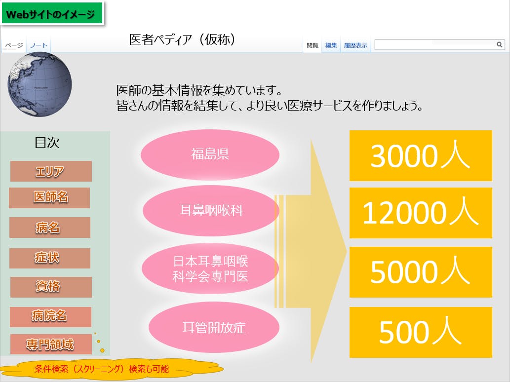 僕は、それはおかしいと思っています。医師の専門領域や学歴、略歴等々の情報が掲載された「医師のWikipedia」が必要ではないでしょうか。情報を結集させるWikipedia方式の医師情報共有サイトを立上げたいと思います。