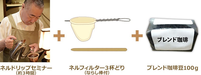 ◆ネルドリップ入門セミナー(ネルフィルター3杯どり+ブレンド珈琲豆100g付):100,000円
