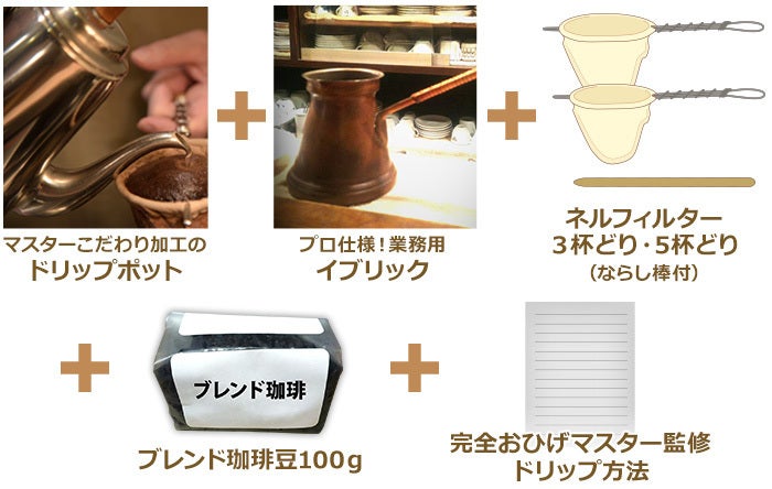 ドリップポット+ネルフィルター2本(3杯どり+5杯どり、慣らし棒付)+プロ仕様イブリック+ブレンド珈琲豆100g(約6~8杯分)+完全おひげマスター監修ドリップ方法がセットになった、ご自宅であんぐいゆそのままの珈琲が楽しめるセットです。お客様へのおもてなしなどに最適です。