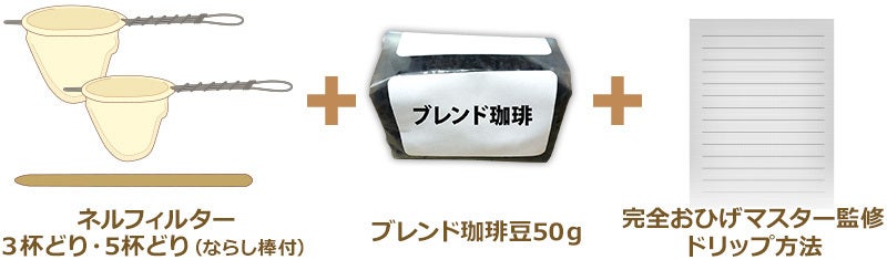 ネルフィルター2本(3杯どり+5杯どり、慣らし棒付)+ブレンド珈琲豆50g(約3~4杯分)のお得なセットです。