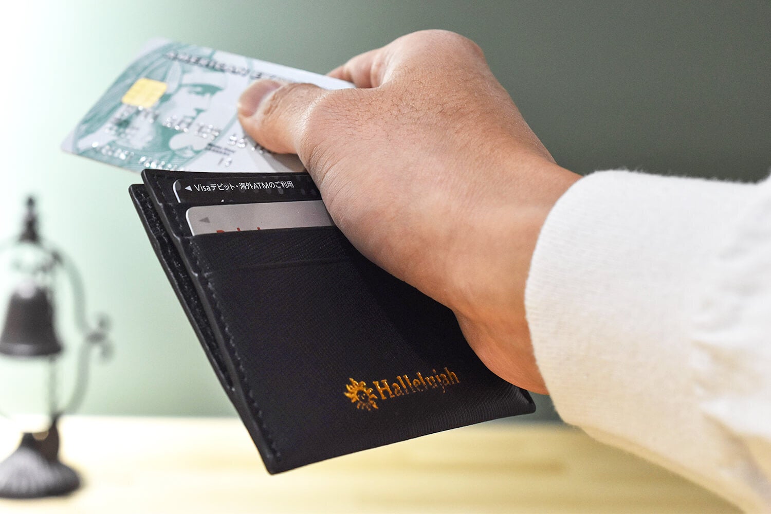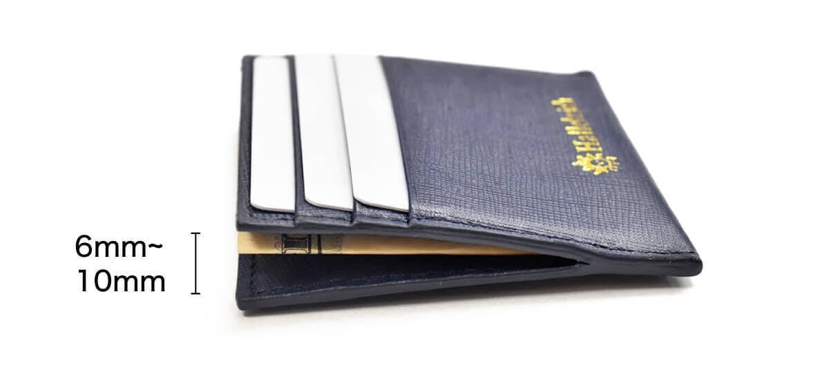 薄さと取り出しやすさを考慮し、カードはむき出しにしています。しかし、カードはポケットにしっかり収まりますので、持ち歩いている最中に落ちることはありませんのでご安心ください。