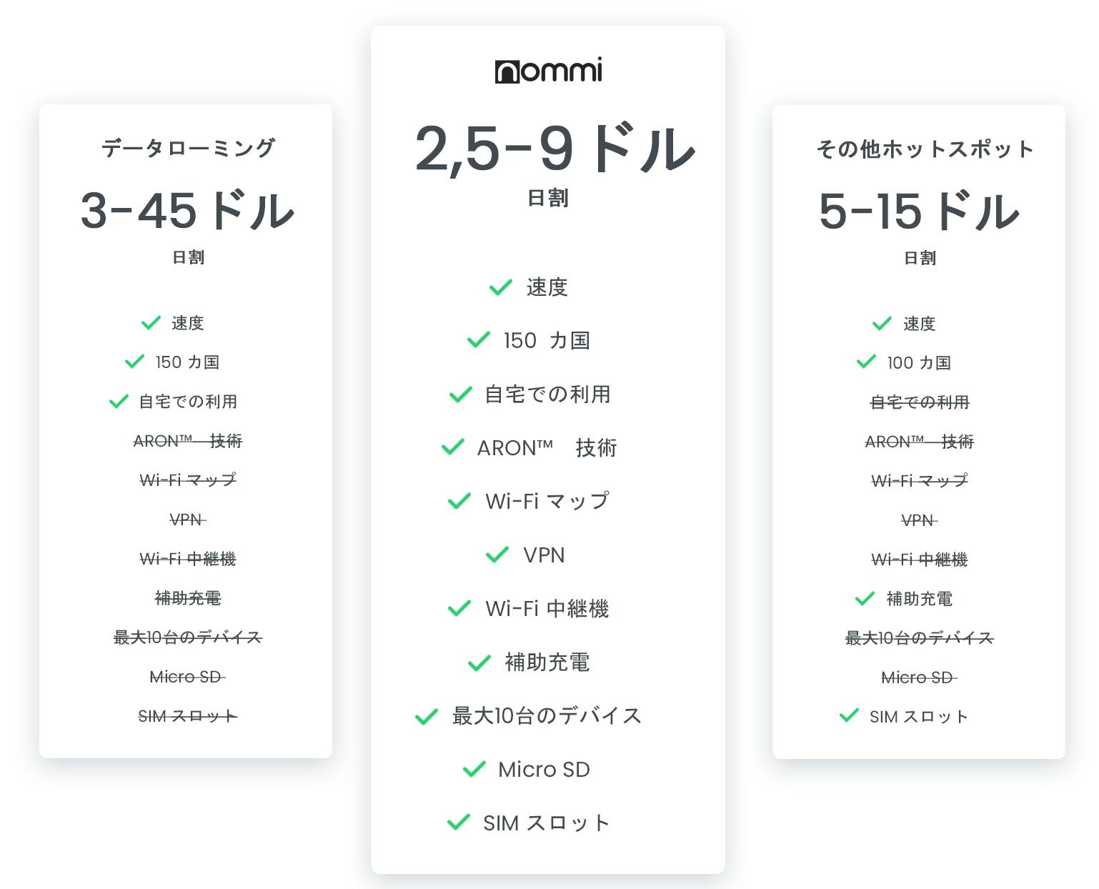 Nommiは旅行用ガジェットの最先端です。 最新の技術を使用して、ストレスのない旅行を実現しましょう。もうカフェやホテルでWi-Fiがあるか、わざわざ聞く必要はありません。