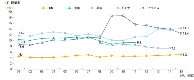 中小企業庁によると、上のグラフのように日本の開業率は上昇傾向にあるものの、欧米と比べるとまだまだ低いのが現状です。特にヨーロッパの開業率が顕著に高いことが読み取れます。