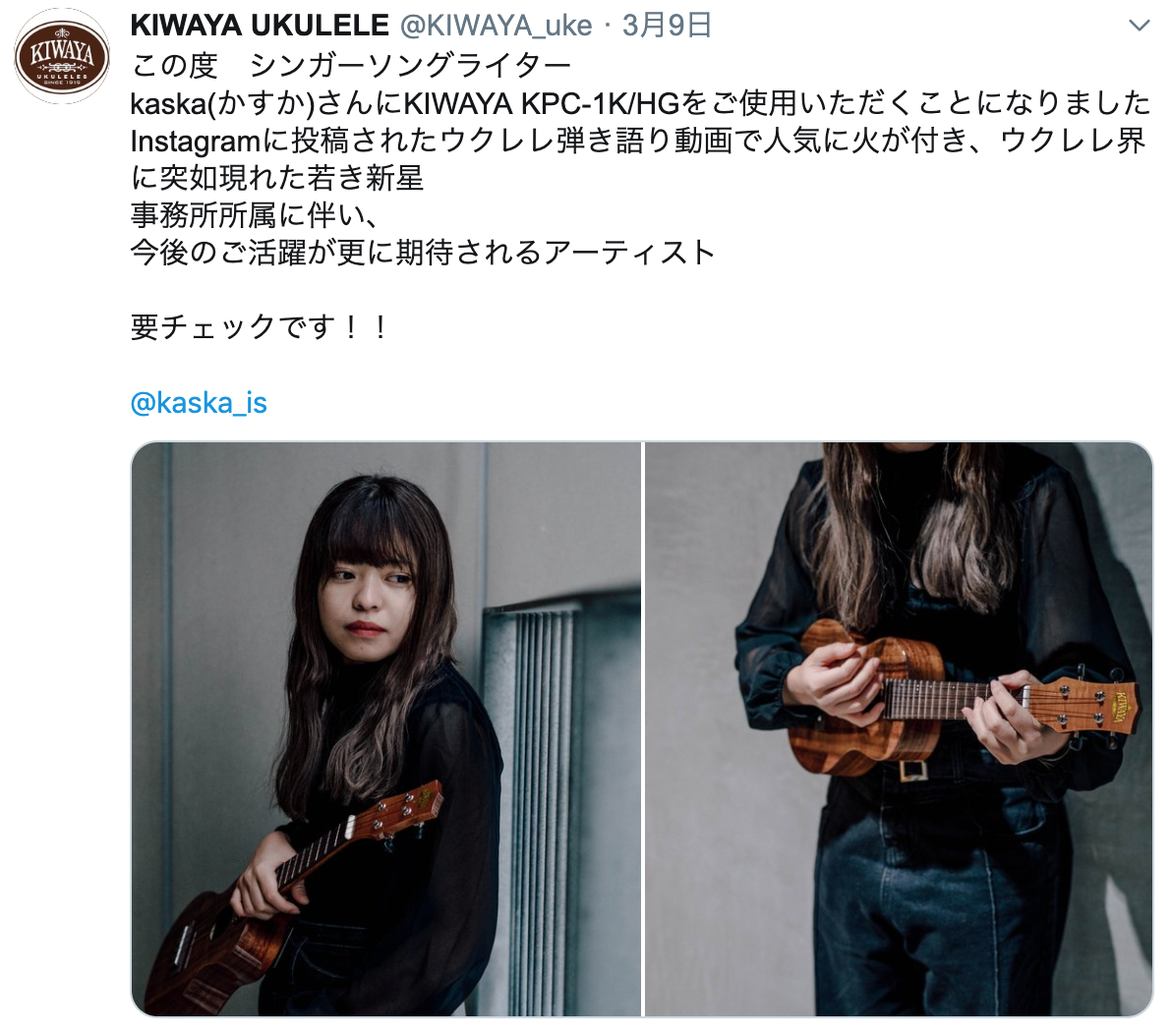 また、これからアーティスト活動をしていくにあたり、ウクレレをKIWAYA様よりエンドース(提供)いただきました。感謝の気持ちで一杯です。本当に、ありがとうございます。