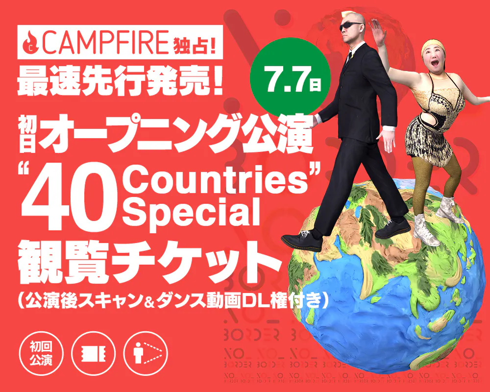 この初日オープニング公演 『40 Countries Special』の観覧チケットを、CAMPFIRE独占で、一般発売に先行して、リターンとして発売いたします!