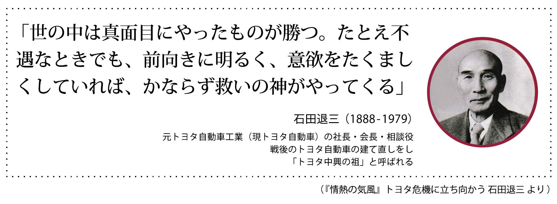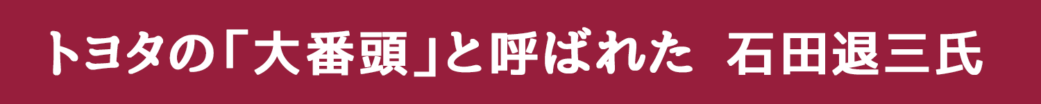豊田自動織機の社長であった石田退三氏は、昭和25年にトヨタ自動車が倒産の危機にみまわれた「トヨタ危機」のとき、トヨタ自動車の社長となって倒産の危機を乗り越え、世界のトヨタの礎を築いた中興の祖です。