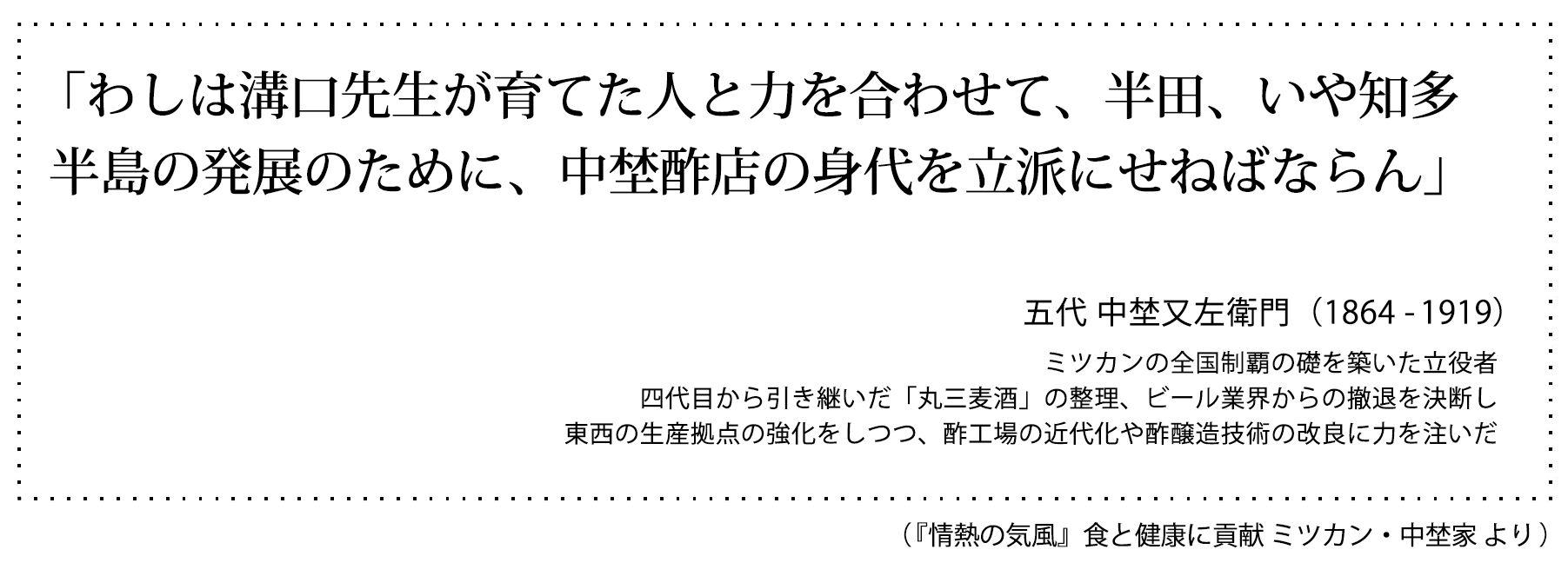 良吉は小鈴谷の鈴渓義塾で溝口幹から教えを受けており、中埜家の二代目と三代目又左衛門は、盛田家の八代目と九代目久左ヱ門の息子です。