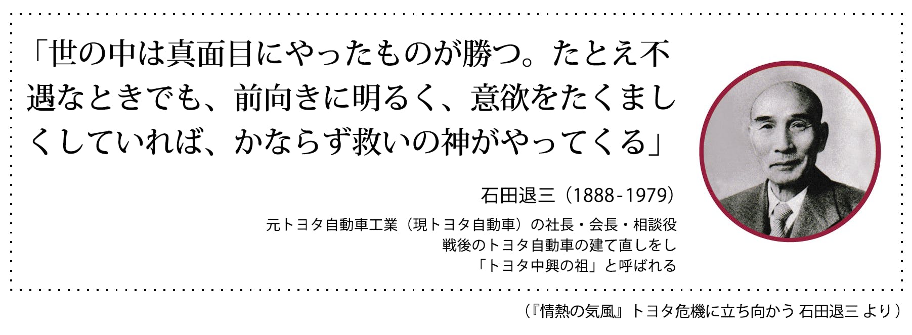 豊田自動織機の社長であった石田退三氏は、昭和25年にトヨタ自動車が倒産の危機にみまわれた「トヨタ危機」のとき、トヨタ自動車の社長となって倒産の危機を乗り越え、世界のトヨタの礎を築いた中興の祖です。